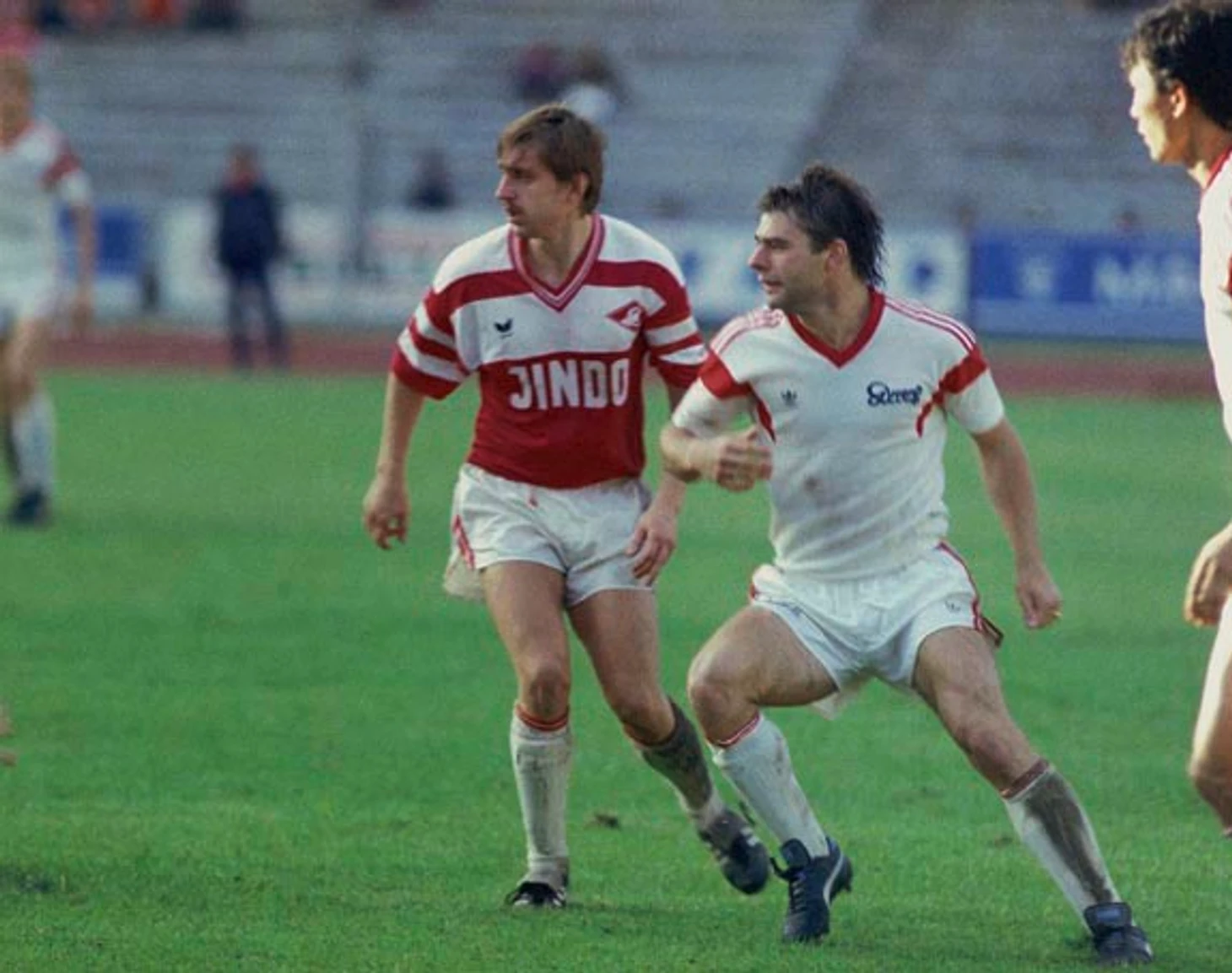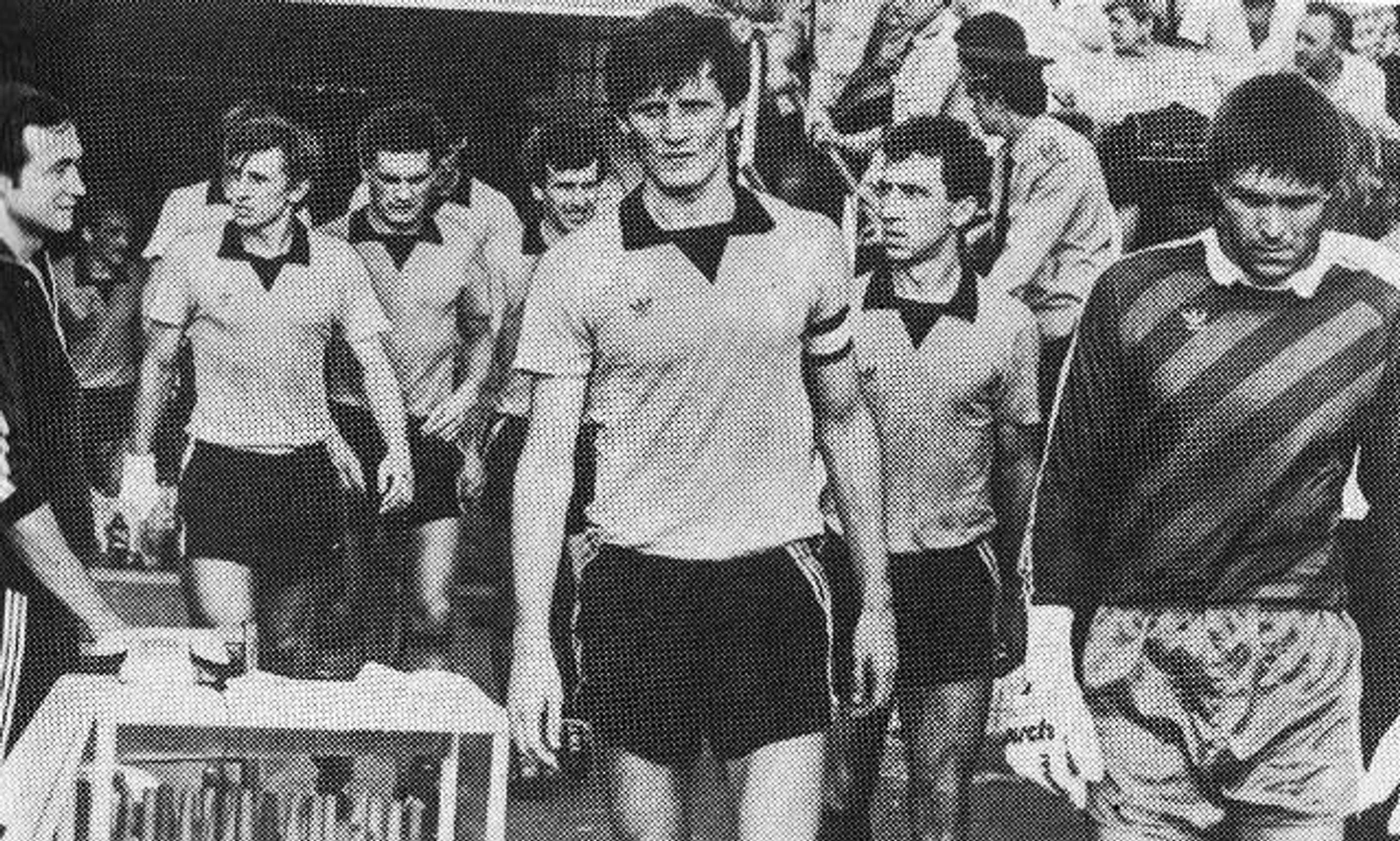 На третьем фото горняки выходят на матч с московским «Динамо». Автор единственного мяча Виктор Грачев (второй после человека в спортивном костюме на дальнем плане) замыкает колонну одноклубников. «Шахтер» после смены руководства впервые побеждает. А команда Анатолия Бышовца, как и минское «Динамо», похоже, свои победные феерии оставила в прошлом тоже.