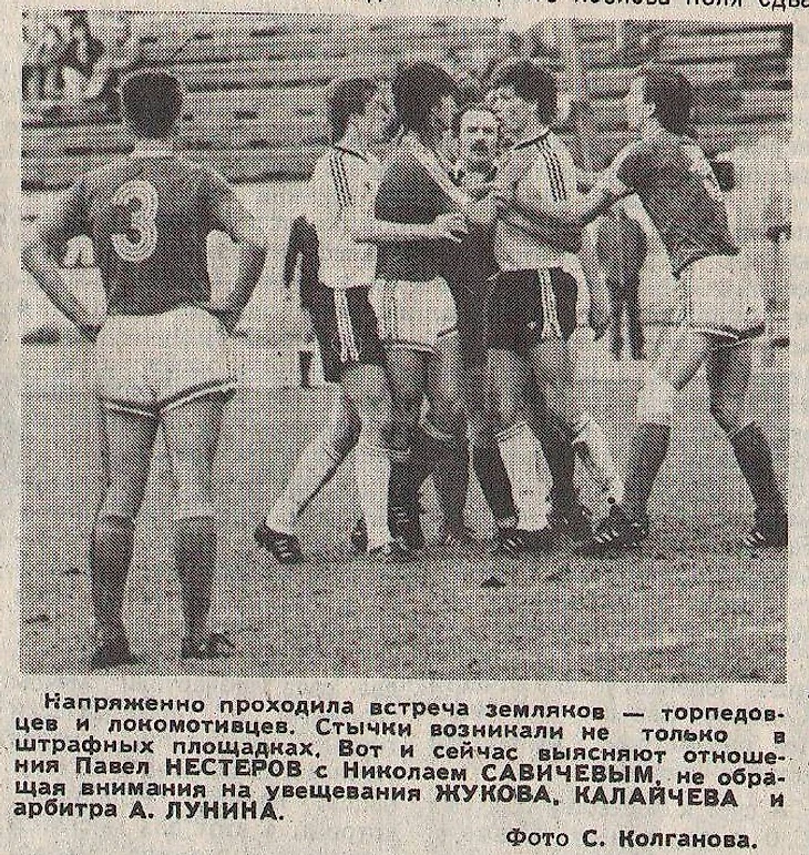Конечно же, в поединке против «Локомотива» явно не хватало на поле Юрия Савичева, заигравшего грубо в последних матчах, что повлекло за собой две желтые карточки (как видим из второго фото, и его брат Николай тоже выделялся буйством на поле – доказательство упадка дисциплины). Плюс в защите отсутствовал Вадим Роговский. Но ведь и у «паровозов» была потеря потерь в обороне – игрок основы сборной СССР Сергей Горлукович. Плюс не смогли выйти на поле опытный Игорь Буланов, недавно усиливший защиту «Локо» из московского «Динамо», и Сергей Бодак. Тем не менее, несмотря на такую существенную утрату, Сёмину удалось найти замену, и оборона его команды во втором тайме отбилась на ноль. Ну а до перерыва парни ЮрПалыча действовали против одного из лидеров в атакующем плане с позиции силы, будто бы сами этими лидерами и являлись.