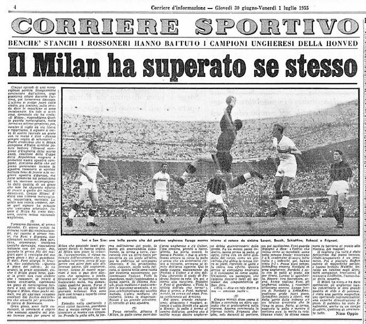 Проведя банкет по случаю удачного сезона, команда уже через три дня сразилась на переполненном «Сан-Сиро» с мощнейшим и самым сильным клубом Восточной Европы той поры. Будапештский «Гонвед» прибыл основным составом, с Кочишем, Цибором, Махошем, капитаном-бомбардиром Ференцем Пушкашем. Парни наставника Яноша Кальмара не привыкли к сравнениям со своими визави, так часто употребляемыми прессой, и были полны желания огорчить стадион, заполненный шестью десятками тысяч тифози. Победить и испортить в тот день чествования чемпионов страны - цели венгров на "Сан-Сиро".