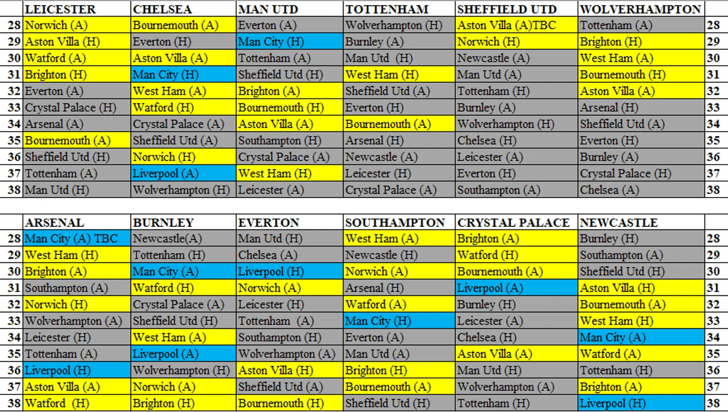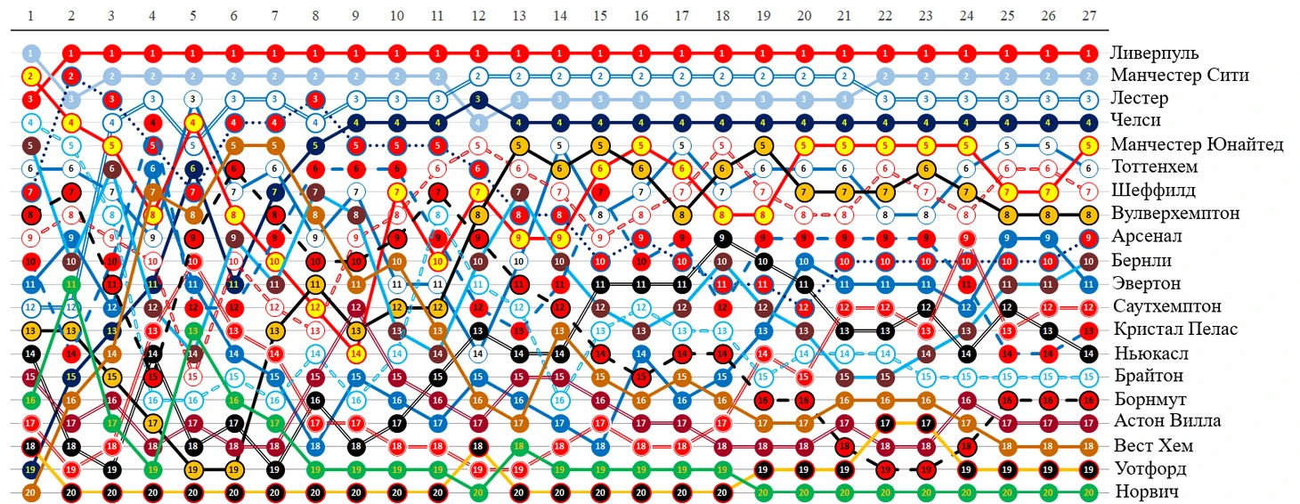 Для удобства восприятия информации, разделим команды на три условных блока. Первый — Ливерпуль, который уже вышел в Лигу Чемпионов, и Сити, оспаривающий это право в Арбитраже. Во второй блок я включил указанные выше 12 команд. В третий - 6 команд, которые борются за прописку в АПЛ на следующий сезон.
