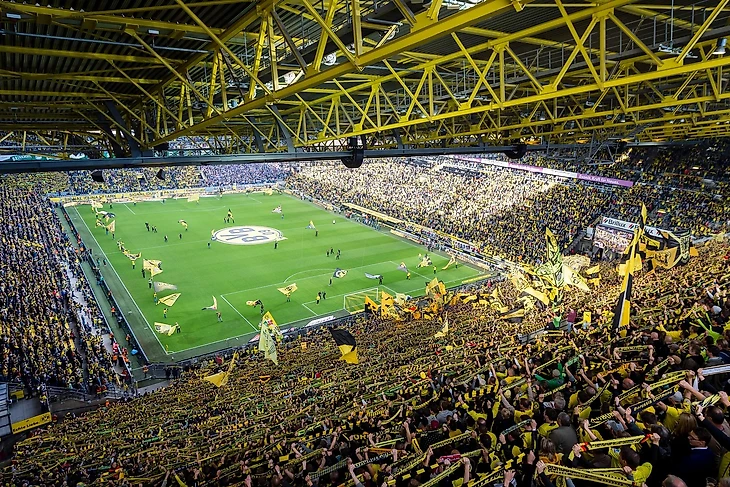 Домашняя арена Дортмудской Боруссии и один из самых посещаемых стадионов мира. «Шмелей» обожают в родном городе. Почти на каждый матч родной команды приходят приходит около 80 тысяч человек. При этом болельщики «Боруссии» одни из самых мощных в мире, а команда – одна из самых играющих. Всё это в совокупности создаёт на стадионе неповторимую атмосферу, находится в которой одно удовольствие. Добавить сюда знаменитую Дортмудсккую стену – южную трибуну арены, где 25 тысяч человек активнее всего поддерживают команду и проводят самые лучшие в мире перформансы, а также уровень соперников «Боруссии» – и получается идеальный храм футбола.