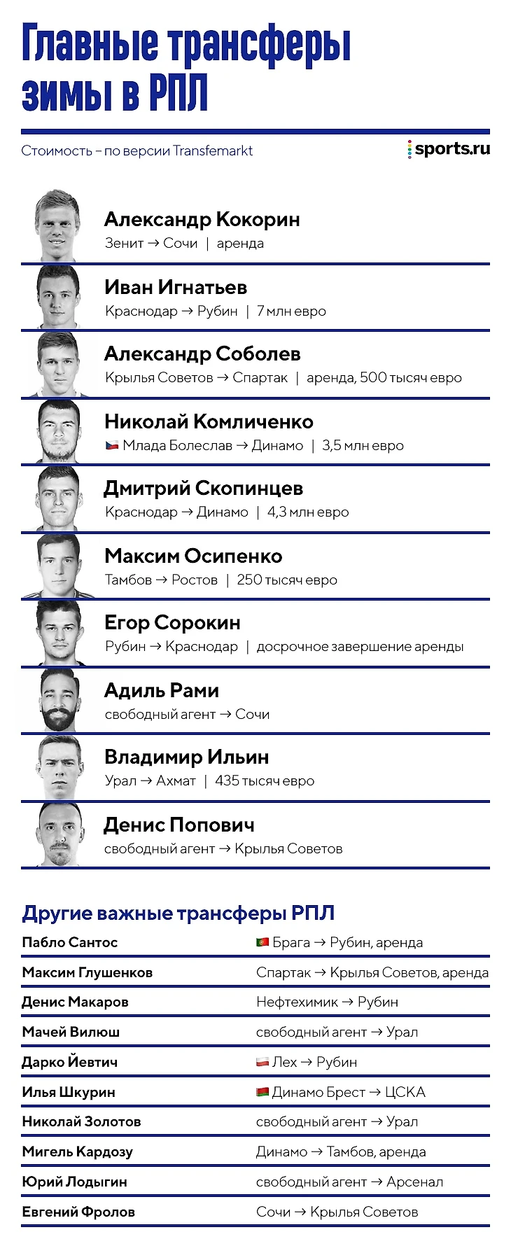 Кокорин и «Сочи», Соболев и «Спартак», новая глобальная перестройка «Рубина», чуть менее серьезные изменения в «Ахмате», поиск нападающего «Локомотивом» (неудачный) и «Динамо» (успешный), перемены на левом фланге обороны «Урала». В последний день трансферного окна в Россию приехал действующий чемпион мира – во второй части сезона точно будет интересно.