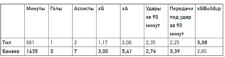 Сравнительная статистика Тила и Бакаева в РПЛ: