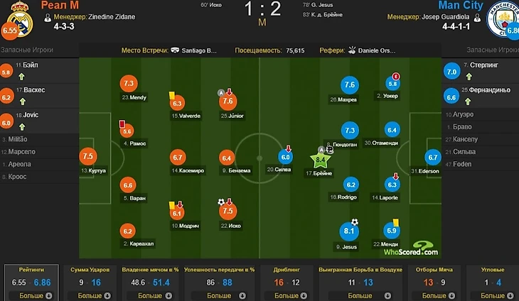 Модрич выглядел крайне блекло, фланг Карвахаля всё таки продавили, Бензема растворился на поле, и впервые в больших матчах лучшими стали именно новички Реала в лице Винисиуса и Менди при стабильной игре Каземиро и подключениях Иско - этого должно было хватить, но не в игре с Сити. Ставка на атаки через левый фланг дала свои плоды, Винисиус и Менди продавали фланг Мареза и Уокера. Комбинация Реала при забитом голе полностью отражало идею Зидана в тактическом плане - высокий персональный прессинг, быстрые атаки через левый фланг.