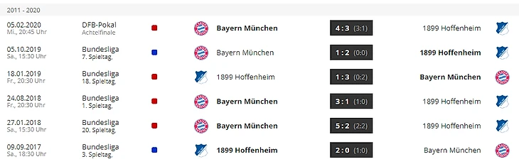С лета 2016 года «Хоффенхайм» взял 10 очков в играх с «Баварией» - три победы, одна ничья, три поражения.