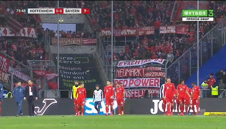 Во втором тайме матч дважды прерывали: на 66-й минуте болельщики «Баварии» вывесили баннер против Дитмара Хоппа – владельца «Хоффенхайма».