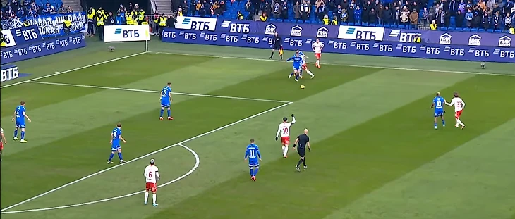 Бакаев страхует Крала, за несколько секунд до этого момента он также отрабатывал на левом фланге обороны.