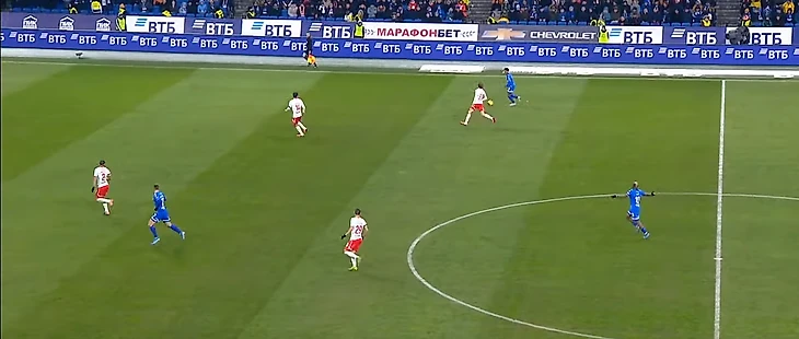 Кутепов не может адресовать мяч Кралу, Рассказов под давлением Скопинцева, в итоге после перепаса между всеми тремя ЦЗ и Максименко, Кутепов отдает длинную передачу Соболеву, который теряет мяч.