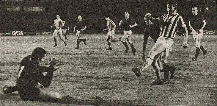 Альбертино Бигон наносит голевой удар по воротам Феличе Пуличи из "Новары", устанавливая окончательный счёт. 8 сентября 1971 года. На "Сан-Сиро" подопечные Карло Пароло (*) пропустили по голу в каждом тайме.