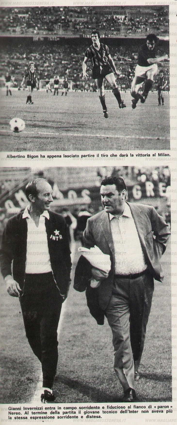 Правый полузащитник Альбертино Бигон , неутомимый футбольный труженик, огорчил «нерадзурри» после паса Бенетти ещё в первом тайме. В тот, облачный вечер 27 тысяч на трибунах увидели, как Бигон забил свой третий мяч «Интеру» в сезоне, ноябрьское дерби в лиге ознаменовалось двумя точными выстрелами футболиста (3:2). Сложивший чемпионские полномочия в Серии А, как оказалось, сошёл с дистанции и в кубке.
