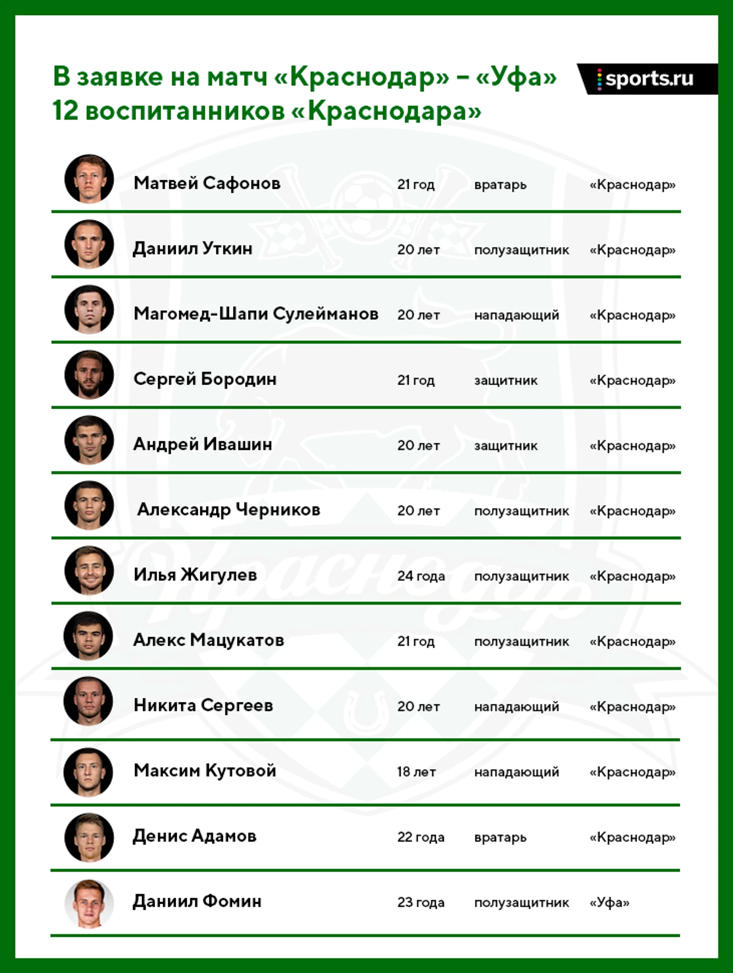 Случилось практически историческое событие: в заявке команды «Краснодара» на матч с «Уфой» было 12 воспитанников «Краснодара». 11 – в «Краснодаре», 1 – в «Уфе».
