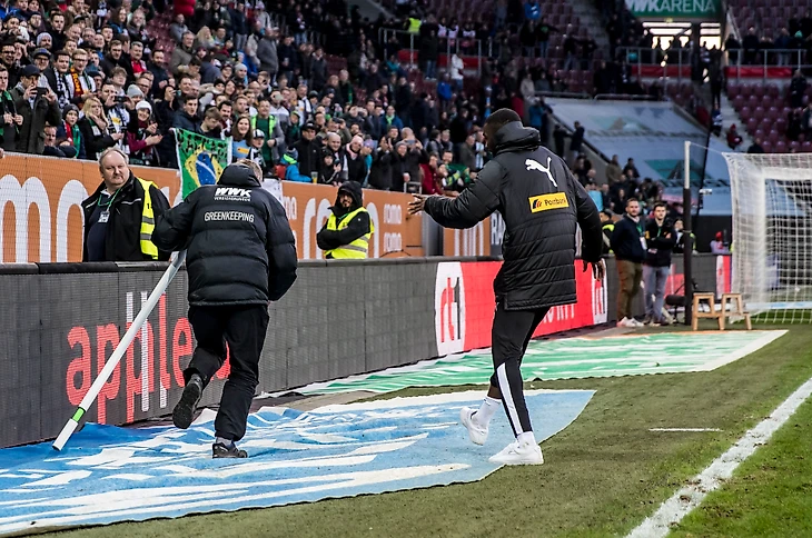 Агроном стадиона опередил Маркуса и убежал с угловым флажком. Французский нападающий удивился от подобного поворота. Тут на помощь Тюраму пришла команда: Матиас Гинтер принес флажок с другого угла. Заодно привели и хитрого агронома – Маркус обнял его и праздновал победу вместе с ним.
