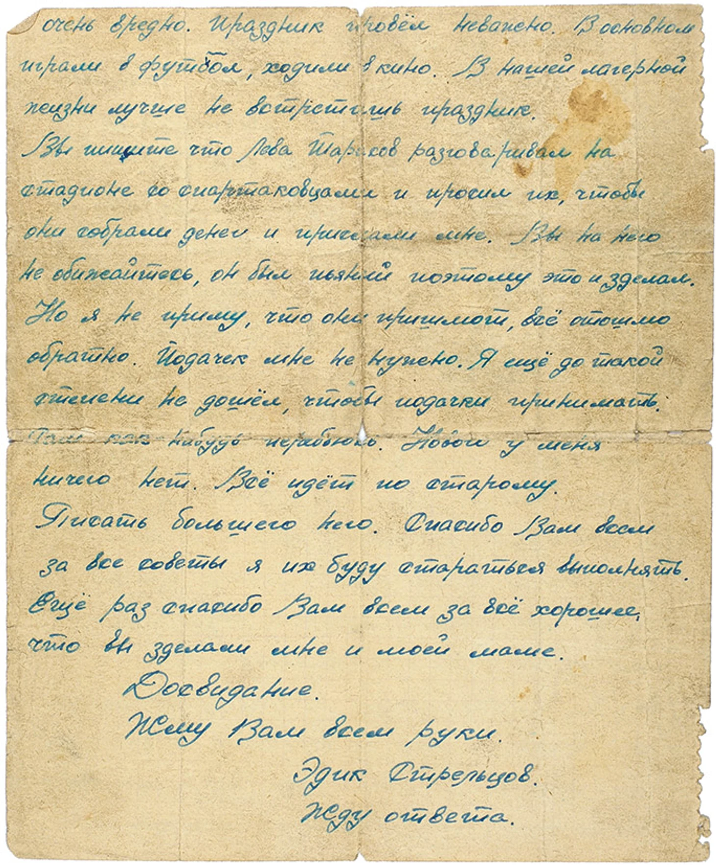 Письма Эдика маме – документ Времени. Здесь и отзвук послевоенного детства, безотцовщины с наибольшим доверием к матери. А еще неосознанное одиночество, на которое выдающийся человек обречен, хотя и окружен в своей славе множеством тянувшихся к знакомству с ним людей.…В них нет и намека на какую-то особенность своего положения в обществе. Популярность Эдуарда для начальников – это скорее минус для него, и вместо ожидаемых поблажек возможны и дополнительные придирки. Но к этому Стрельцов готов. Единственное, чего старается он избежать, так это лишних унижений. И как ни жаждет он досрочного освобождения, в письмах он все настойчивее просит мать – не унижаться ни перед кем в ее хлопотах за него, он потерпит, он все вытерпит…