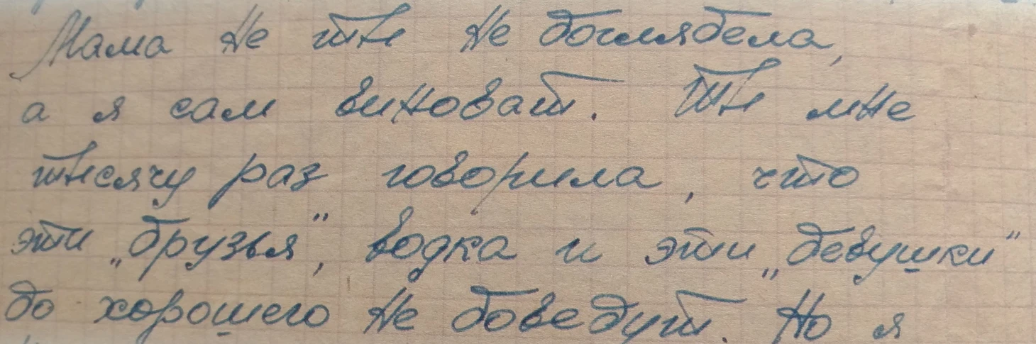 «…мама, ты пишешь, что отбирают квартиру. Отдай им эту комнату и не расстраивайся. Буду жив и здоров, заработаем все потерянное, а если не заработаем, то проживем и на пятнадцати метрах. Самое главное для меня, это чтобы ты была жива и здорова…Приеду я только к тебе»…