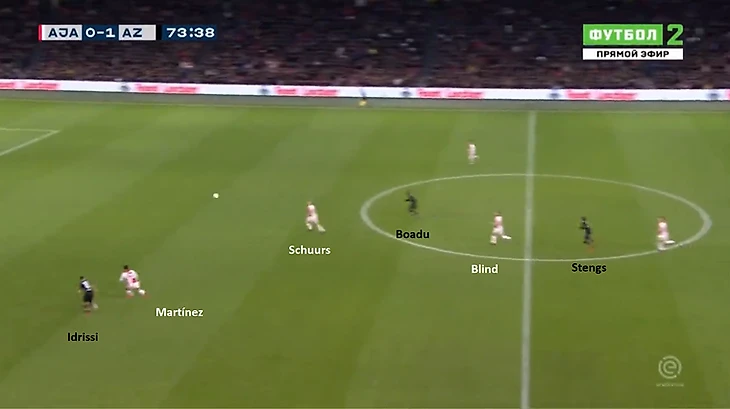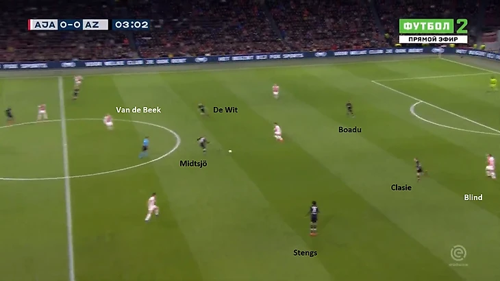 «Аякс» тен Хага приучил, что на позициях номинальных вингеров выходят футболисты с широким диапазоном действий. Промес, Зиеш и Тадич часто смещаются в центр. Они же первыми начинают прессинг. Эта модель освобождает фланги крайним защитникам – Тальяфико и Десту/Мазрауи. И хотя позади линии мяча остается три футболиста (чаще всего, это два защитника и опорник), пространства, открывающиеся перед контратакующей командой огромны. Футболисты АЗ умело этими просторами пользовались (особенно в первом тайме), формируя в центре поля треугольники с Боадю на острие.