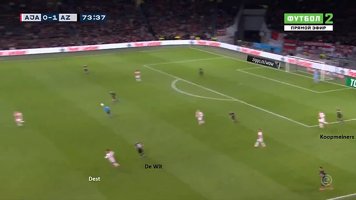 В том случае, если крайние защитники «Аякса» решались смещаться в центр, чтобы перекрыть возможные передачи на полузащитников АЗ, следовал дальний заброс на свободного Идрисси. Именно это произошло в случае со вторым голом, когда Дест оставил свой фланг Мартинесу и пошел накрывать де Вита в центральной зоне.