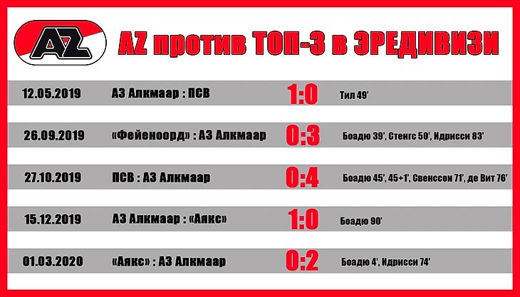 АЗ нанес «Аяксу» уже восьмое поражение в сезоне. В предыдущих двух было меньше: в 2017/18 – 7, в 2018/19 – 6.