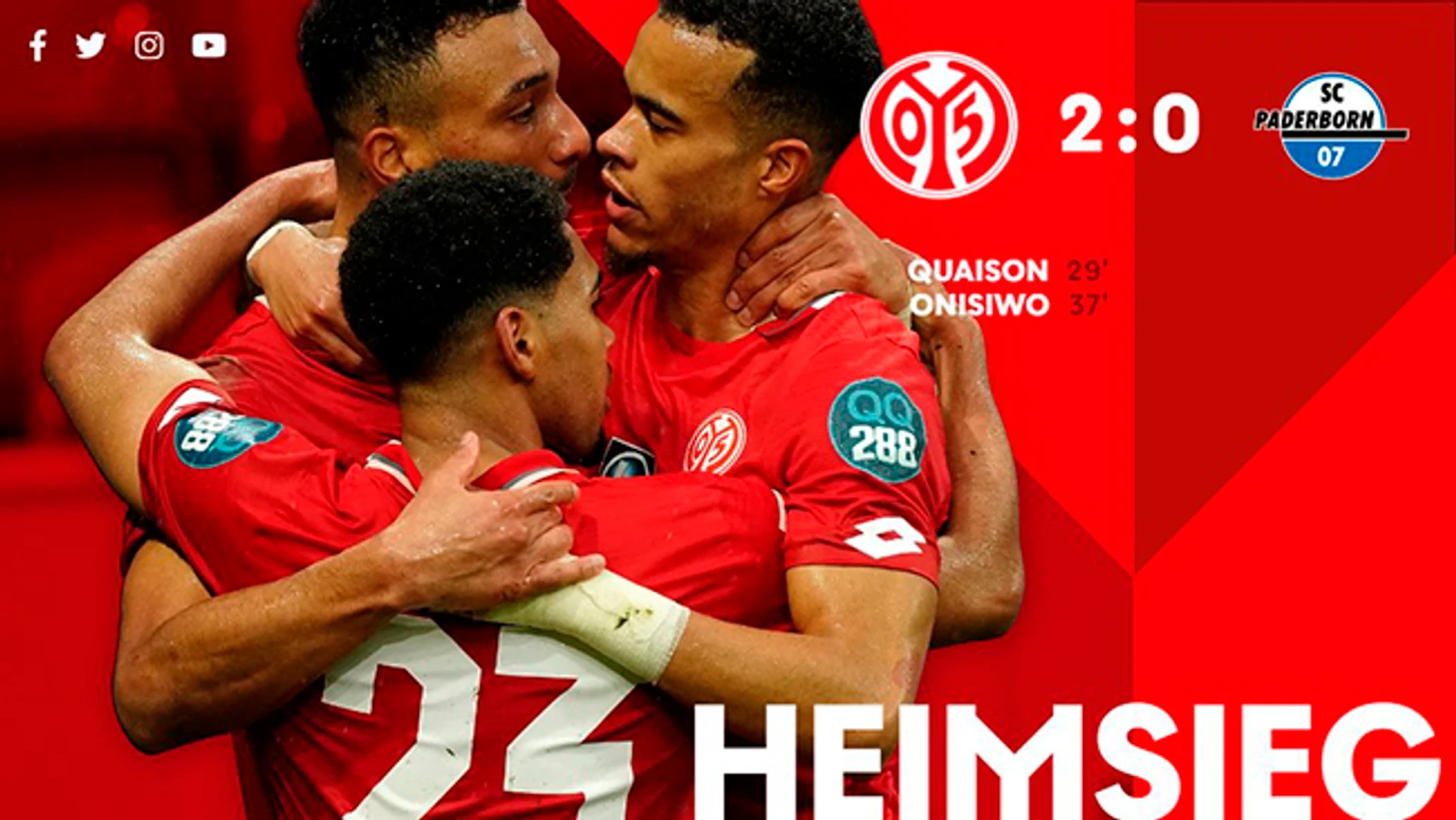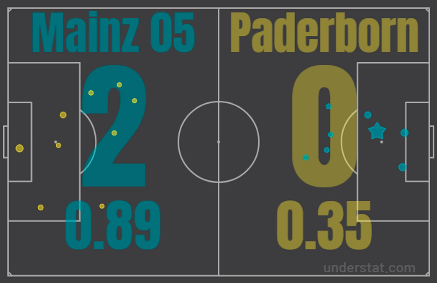 Меньше, чем 10 минут, потребовалось принимающей стороне, чтобы удвоить счёт. На сей раз после успешной комбинации от Озтунали, Матеты и Квайсона мяч получил Онисиво, который и закончил атаку. После перерыва в Майнце даже начало светить солнце, но на игре это сказалось скорее отрицательно. «Падерборн» уже не был так опасен, как в первом тайме, за исключением пары дальних ударов ближе к концу. А «Майнц» уже не мог воспользоваться выпадавшими шансами, но итогом всё равно может быть доволен: отрыв от зоны стыковых матчей у него чуть увеличился.