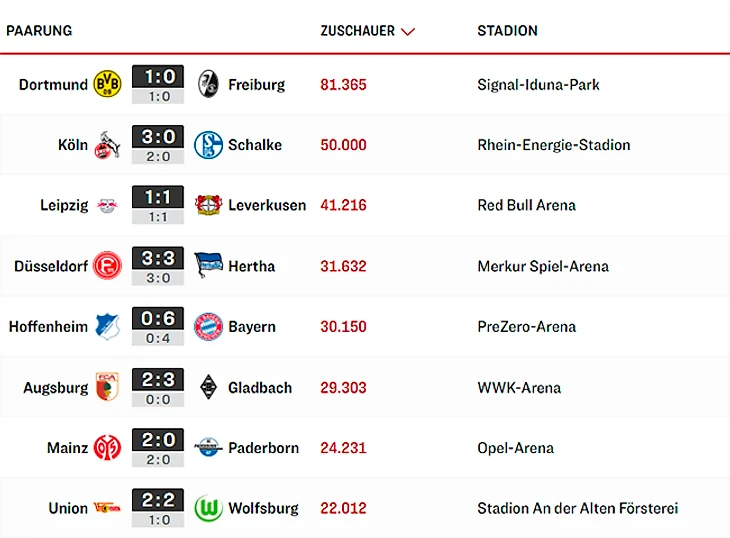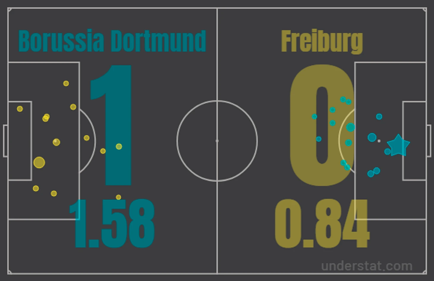 Кажется, все голы топ-3 немецкого чемпионата были забиты «Баварией». «Дортмунд» в своём домашнем матче против «Фрайбурга» начал с доминирующей позиции и с ожидаемым контролем мяча. Первый же свой большой момент после комбинации от Брандта и Азара на Санчо они реализовали, но, как станет по итогу, этот забитый мяч останется единственным в этом матче. Во второй половине первого тайма можно было увидеть неплохое давление гостей и дальние удары хозяев. После перерыва ситуация не изменилась: «Боруссия» всё ещё чётко оборонялась и с новой силой выдавала череду моментов у ворот «Фрайбурга». Ближе к 70-й минуте хозяева выдали опять пассивную фазу и едва не поплатились за это, когда удар головой Петерсена был вытащен с линии Пищеком. В результате «Дортмунд» выигрывает с минимальным счётом и продолжает следовать за лидерами чемпионата, а «Фрайбургу» стоит отдать должное за достойную игру на выезде.
