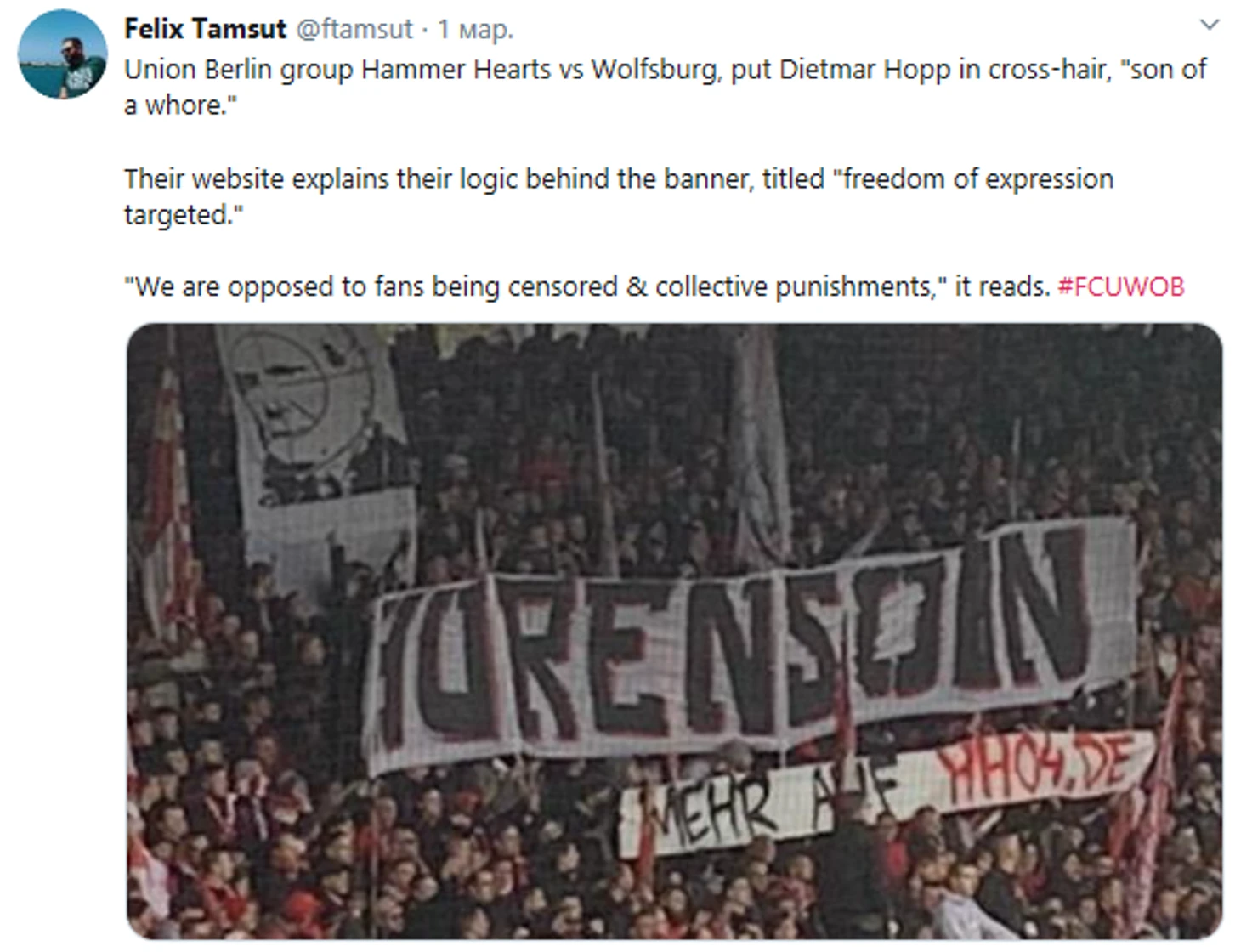 Болельщики «Униона» так же выступили с баннерами о Дитмаре Хоппе, написав на своем сайте, что против цензуры, запретов и коллективных наказаний. Их встреча с «Вольфсбургом» тоже приостанавливалась.