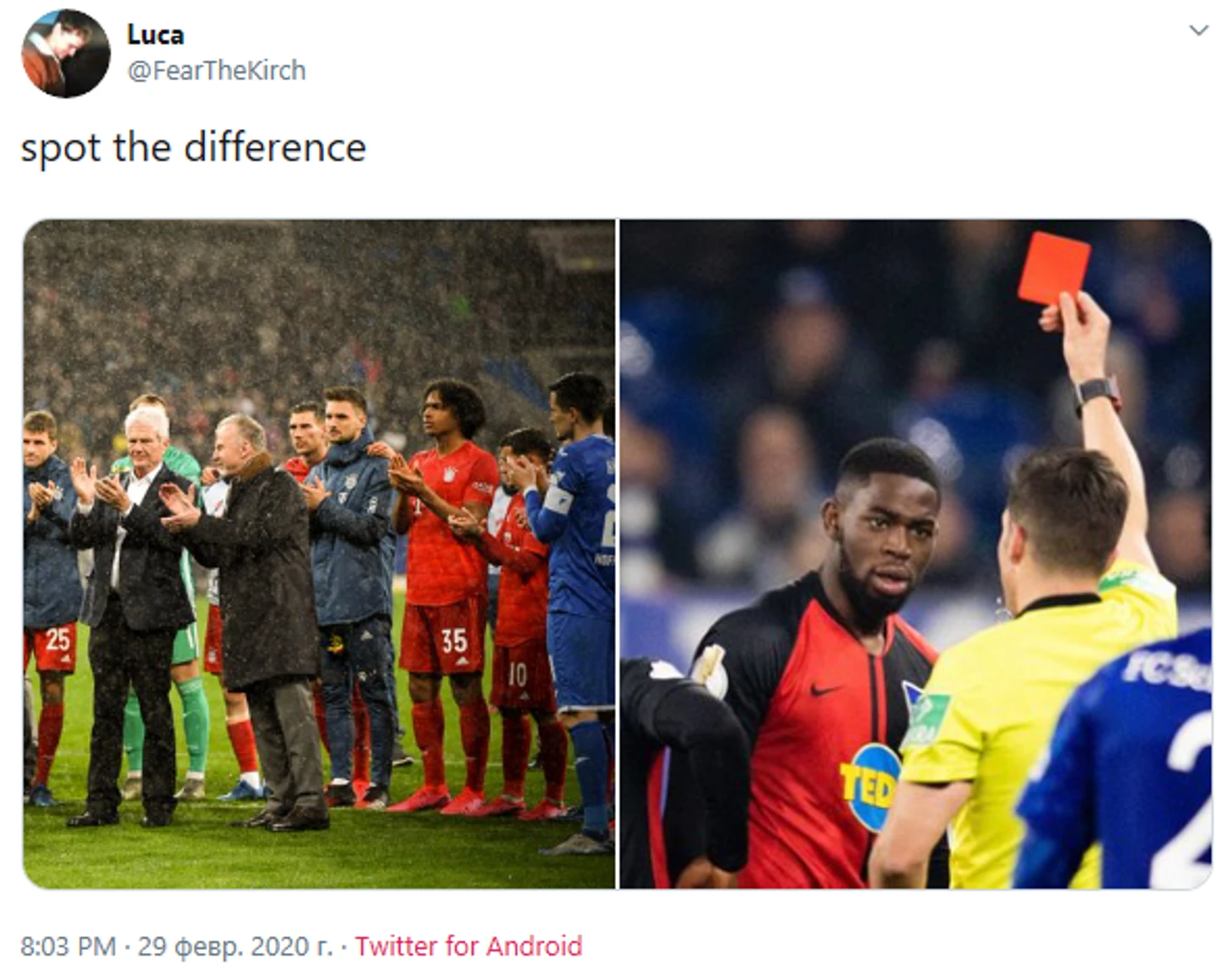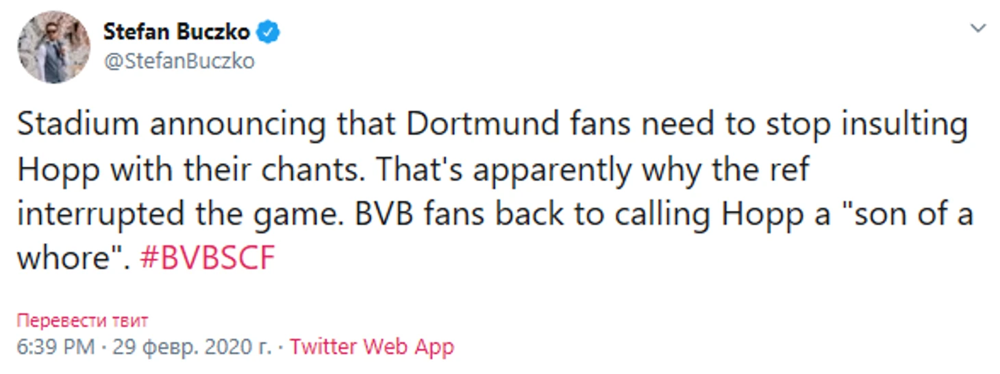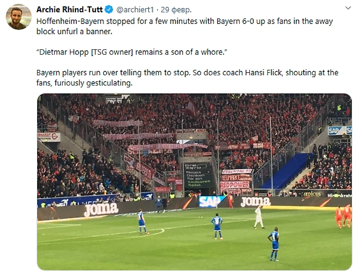 Болельщики «Баварии» вывесили баннер «Дитмар Хопп с**ин сын», после чего игра остановилась, а игроки гостей побежали к ним с просьбами прекратить, что так же сделал и тренер Ханси Флик.