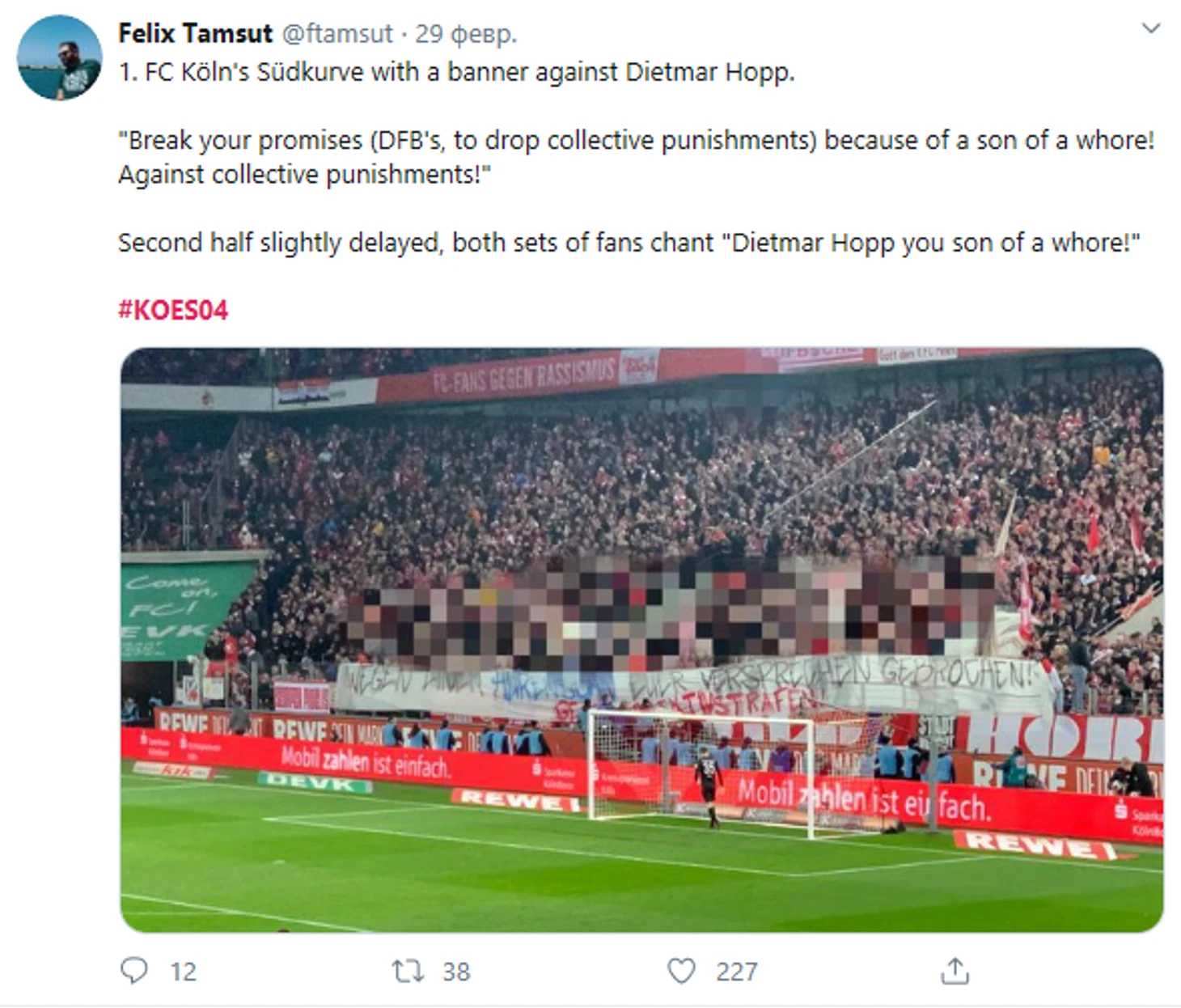 Болельщики «Кёльна» присоединились к акции против коллективных наказаний. Их игра с «Шальке» так же была на некоторое время остановлена из-за кричалок «с**ин сын» в сторону Хоппа.