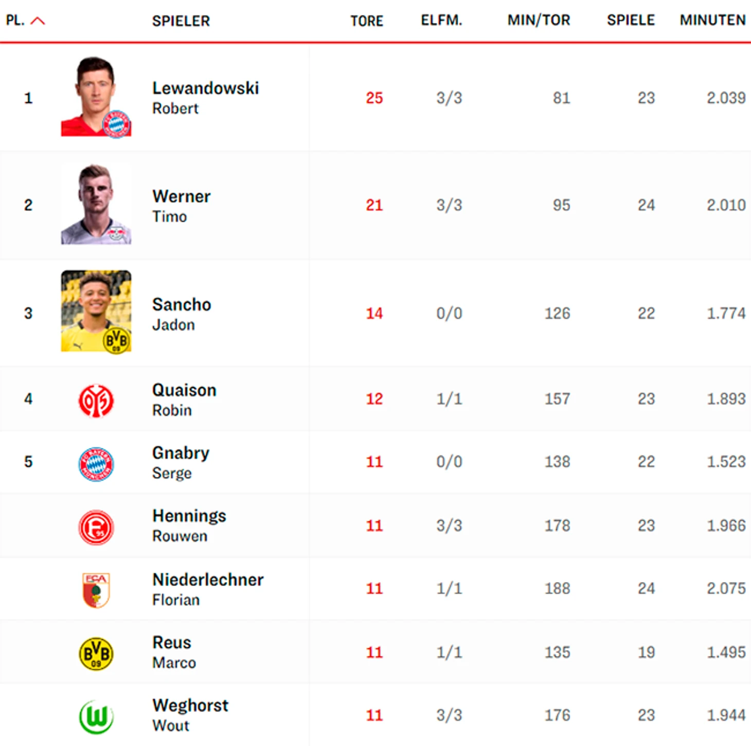 Джейдон Санчо забил в тринадцати матчах Бундеслиги одиннадцать голов. Санчо превращается из ассистента в бомбардира, так в матче против Фрайбурга он пробил больше всех (четыре раза) по воротам соперника.
