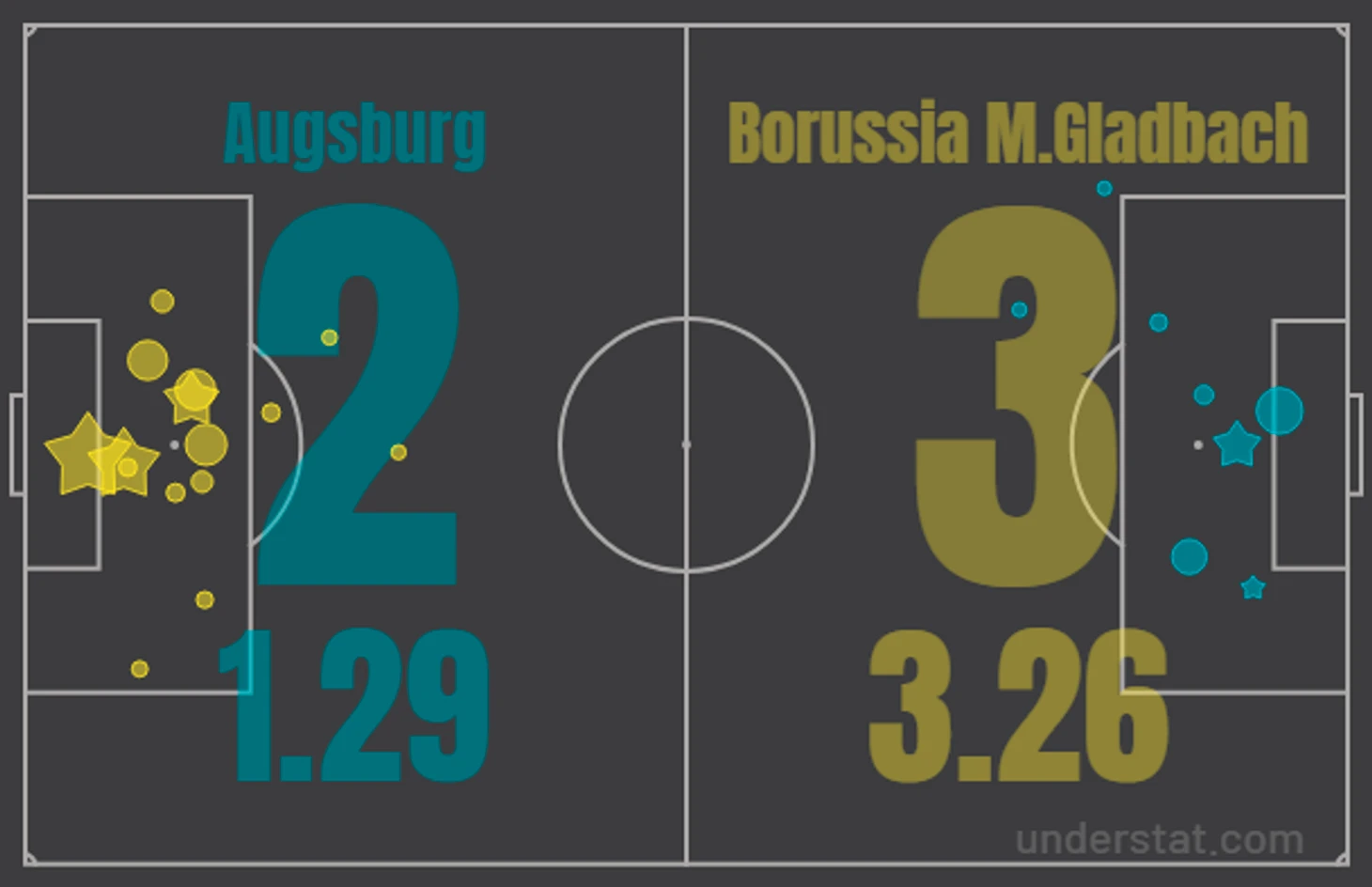 Встреча между «Аугсбургом» и «Гладбахом» стала единственным матчем тура, где не было забито ни одного гола в первом тайме. Первые 35 минут матча отлично характеризует тот факт, что жёлтых карточек там было показано больше (три), чем нанесено ударов по воротам (один). На 36-й минуте Штиндль наконец-то нанёс опасный удар по воротам «Аугсбурга», а спустя пару минут били и Нойхаус и Хофманн. Но вратарь хозяев Коубек своими сейвами всё же не позволил выйти гостям вперёд до конца первого тайма.