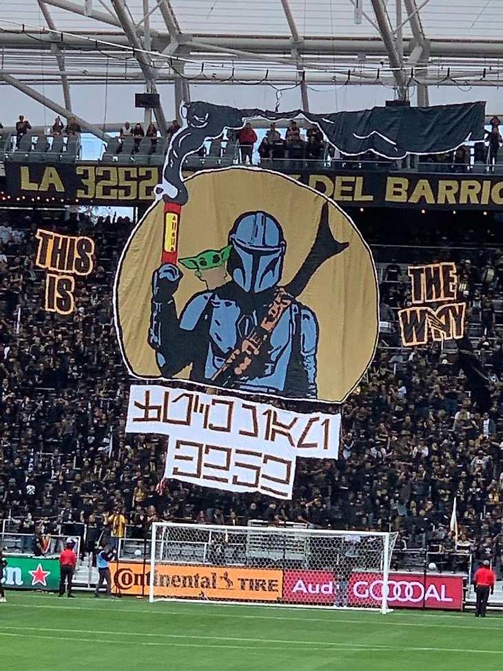 Фанаты клуба ФК «Лос-Анджелес», в составе которого вы можете знать голкипера Вермеера и вингера Брэдли Райта-Филлипса (младший брат того самого Шона Райта-Филлипса), а также главную звезду чемпионата мексиканца Карлоса Велу, на игре против «Интера» (Майями) пошли еще дальше в теме кинематографа в перфомансах и изобразили малыша Йоду в своем хорео. Фраза «Таков путь», изображенная на баннере, является мемом из «Звездных войн» и используется там мандалорцами и на мандалорском языке является фразой-мантрой.