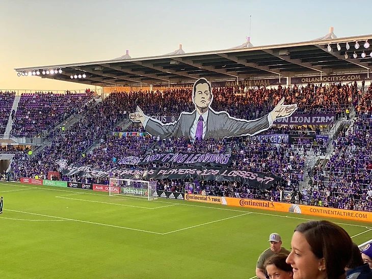 Откроем обзор перфомансом на матче «Орландо Сити»-«Реал Солт-Лейк», где фанаты «львов» изобразили Леонардо Ди Каприо в образе персонажа Джордана Белфорта из фильма «Волк с Уолл-стрит», сопровождая это подписью: «Владельцев – 2, тренеров – 3, сезонов – 5, игроков – 129, поражений – 77. Мы не собираемся уходить!».