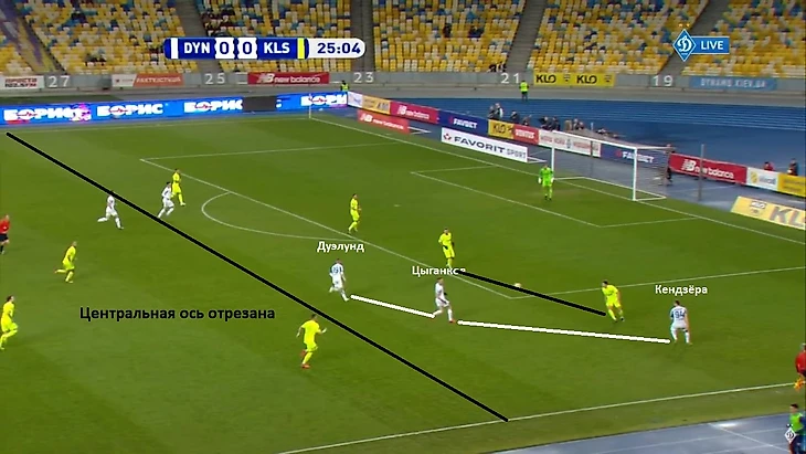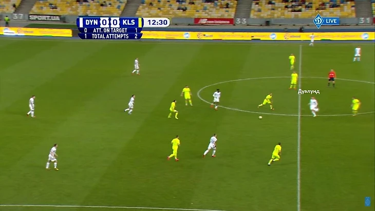 На картинке ниже все полузащитники Динамо закрыты Колосом, крайки Динамо слишком низко из-за чего получается расположение 4-1 в первой стадии атаки. Единственный свободный игрок - Дуэлунд который вне кадра открывается между линий.