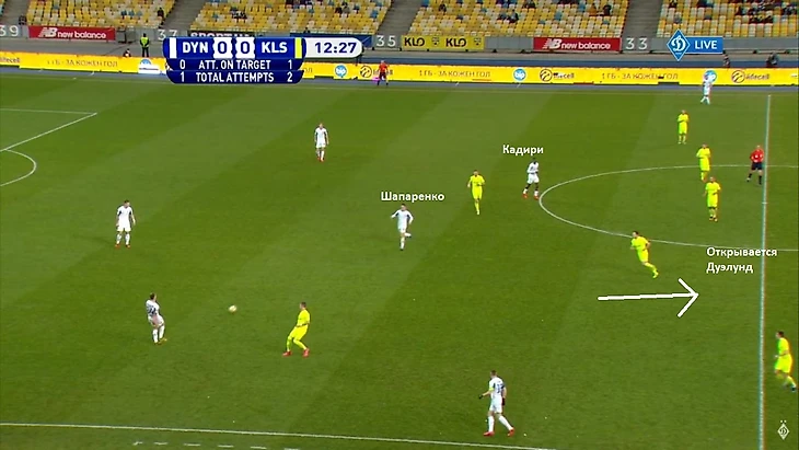 Шапаренко опускается к Кадири и ищет передачей Дуэлунда который отлично открывается между линий.