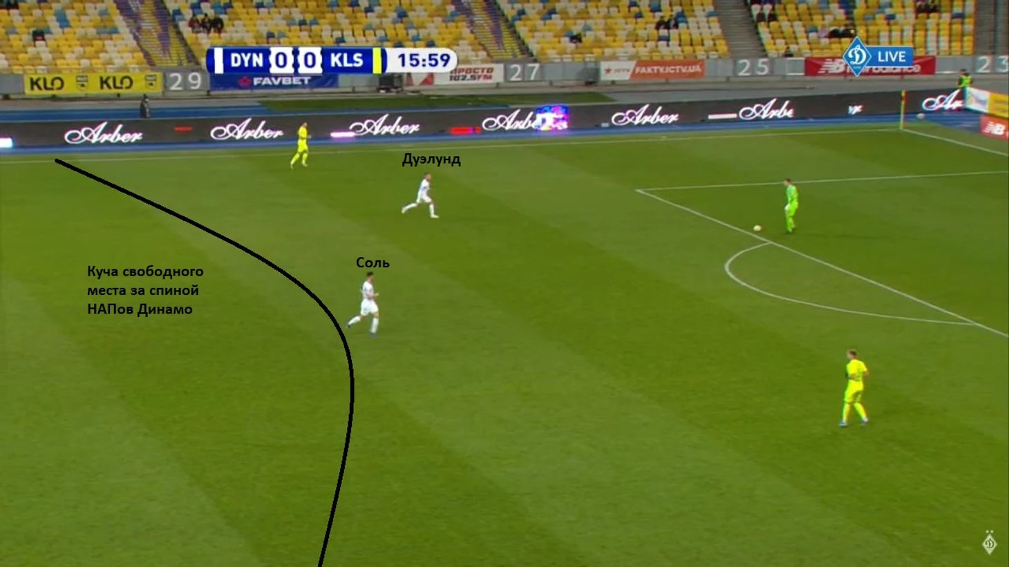 Динамовцы стерильно разыгрывали мяч и плохо продвигали его в финальную треть. Единственной опцией для передач между линиями был Дуэлунд, который по моему мнению являлся лучшим игроком Динамо в превом тайме, так как отлчно находил пространство и довольно хорошо прессинговал в отличии от Соля. Возможно крайним полузащитникам нужно было располагаться уже, за второй линией обороны Колоса , а крайним защитникам идти сильно выше чтобы сдерживать крайков Колоса в широких позициях. Также Соль мог опускаться к Дуэлунду и искать там пространство однако тогда ЦЗ Колоса были бы слишком свободны и могли бы выдвигатся в опорную для подстраховки.