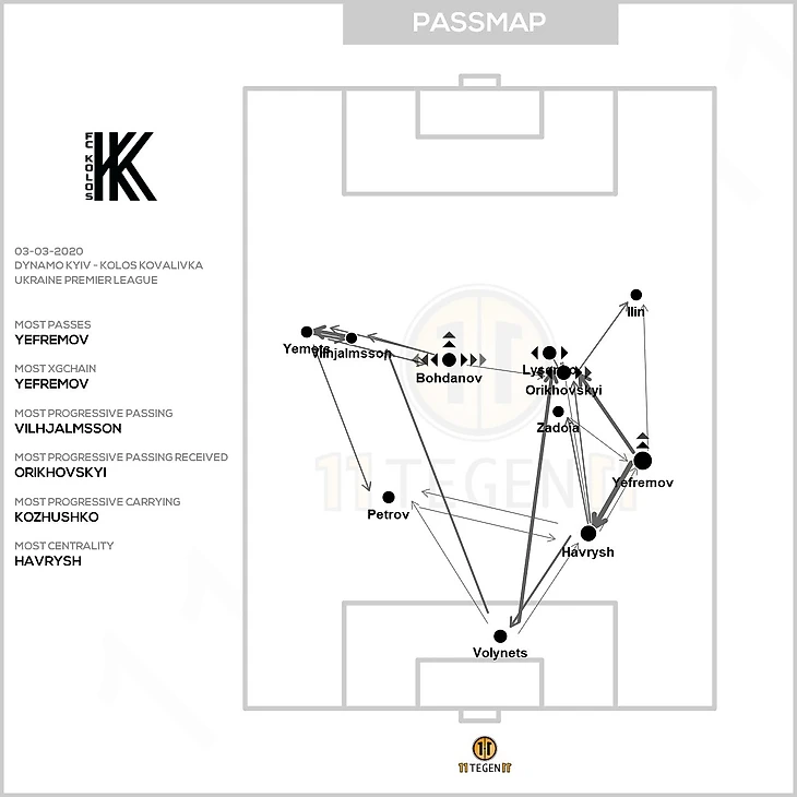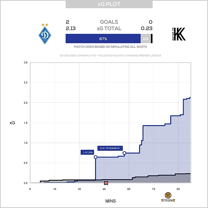 По моему мнению подходы Колоса были опаснее атак Динамо, однако им не хватило качества исполнения в финальной трети поля. Гол киевлян не вытекал из игры и скорее был случайностью. И это против худшей команды УПЛ по xGA(допущенным моментам).
