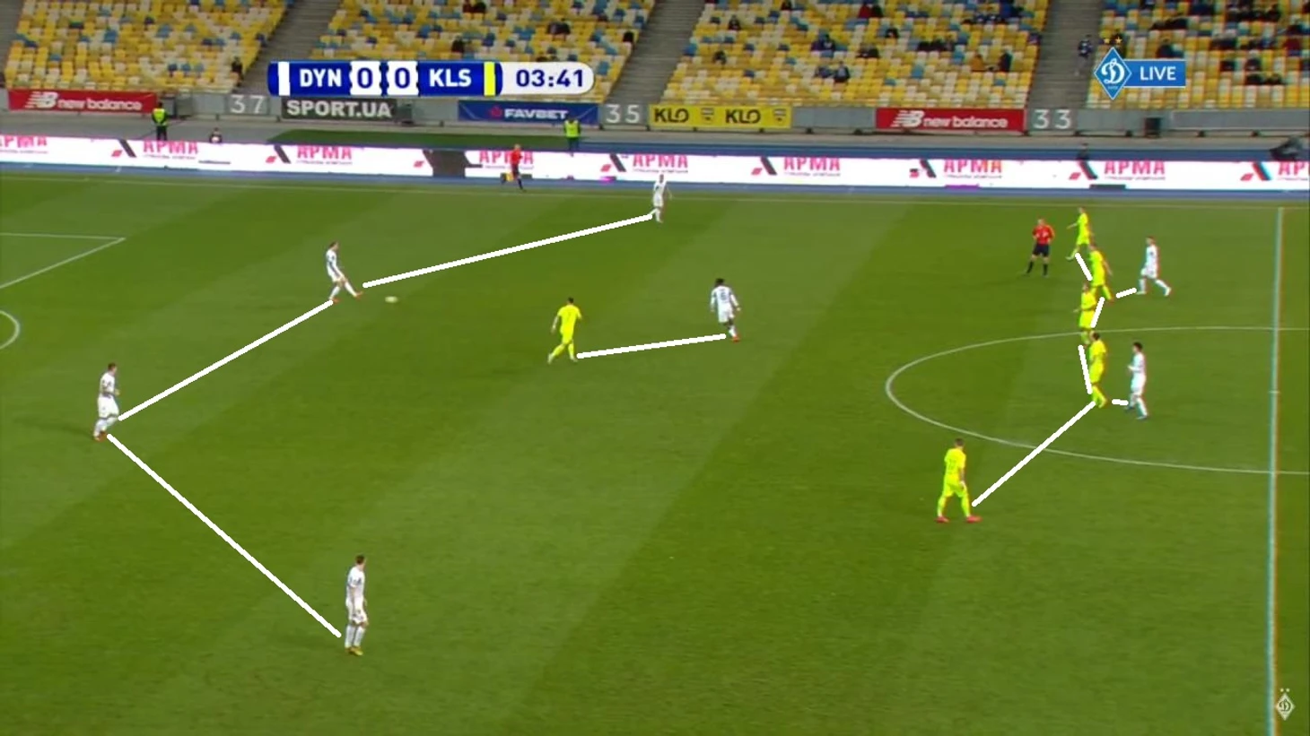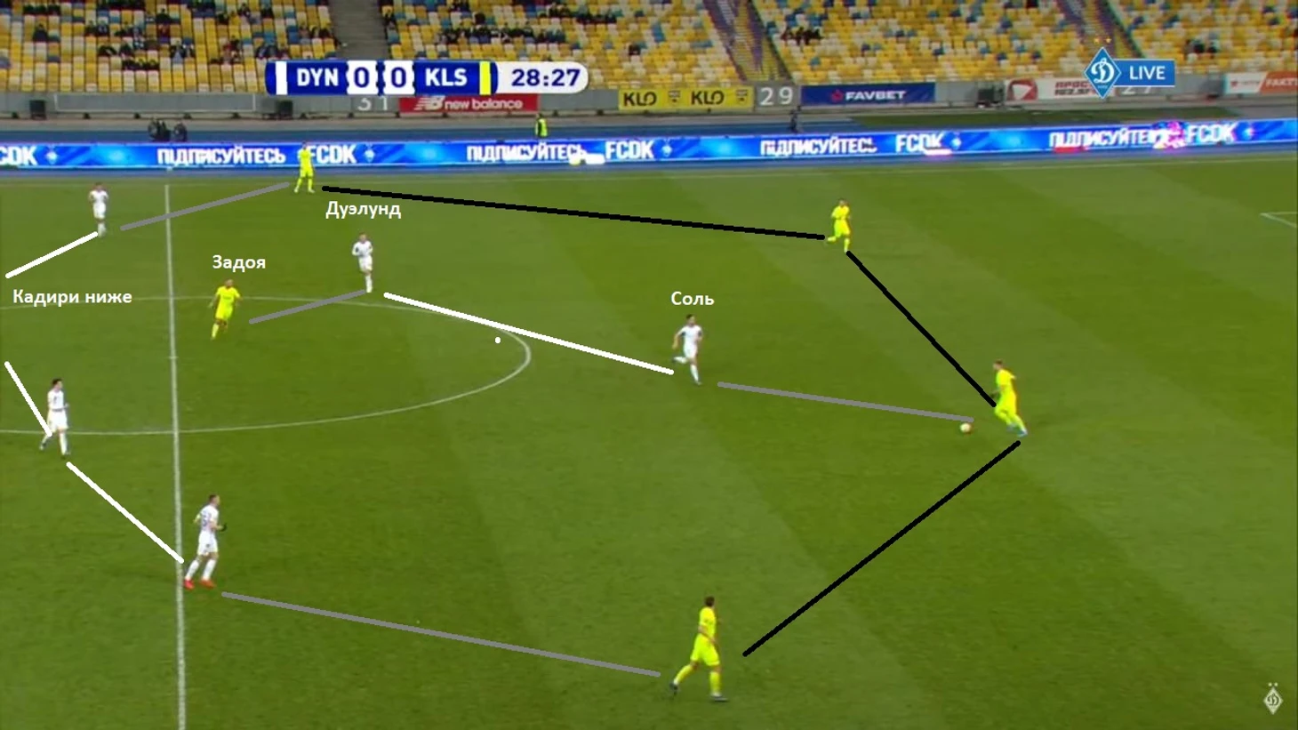 Когда крайние защитники Динамо шли высоко, у киевлян сразу находились линии передач для продвижения в финальную треть и комбинаций на фланге.