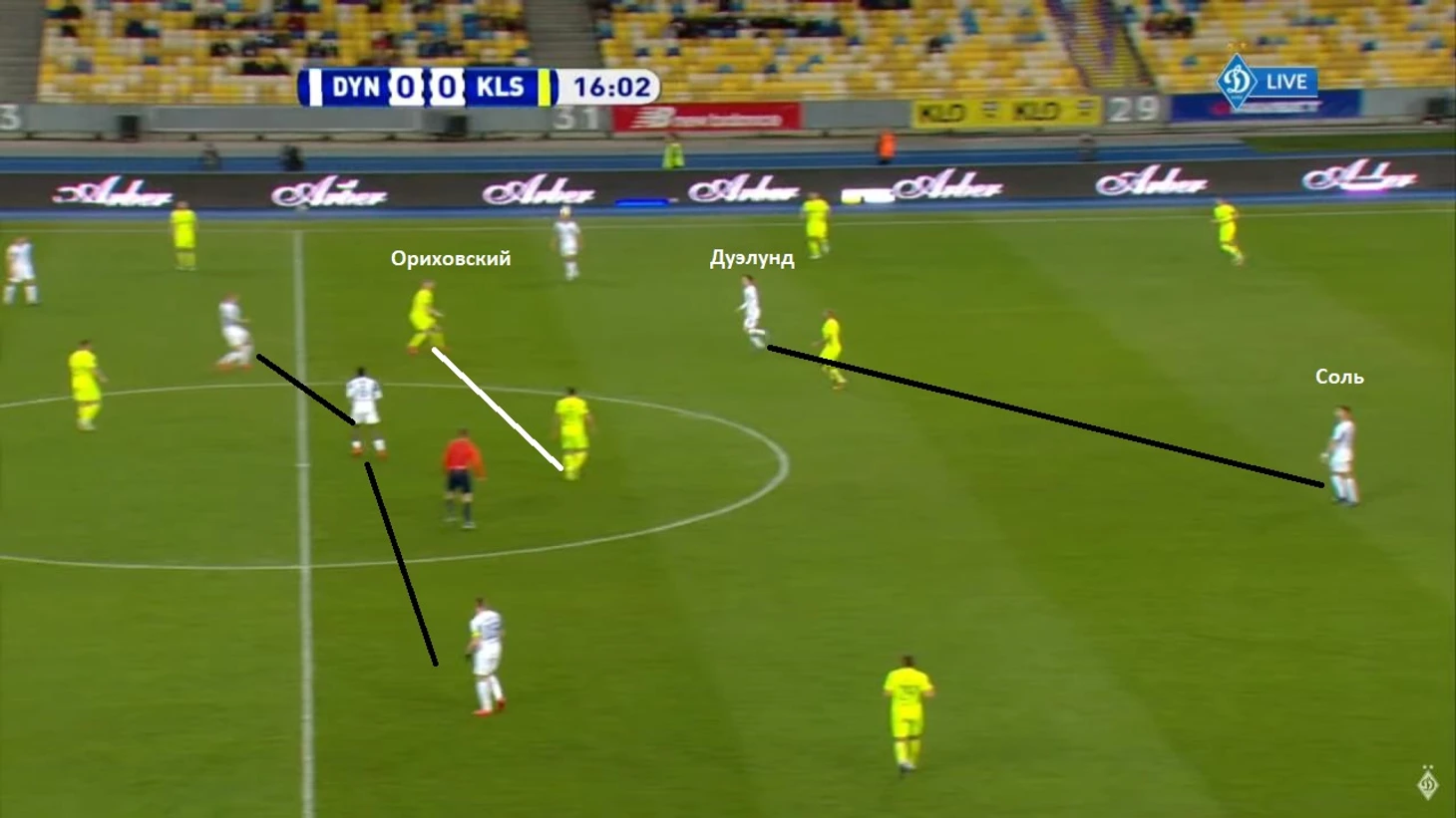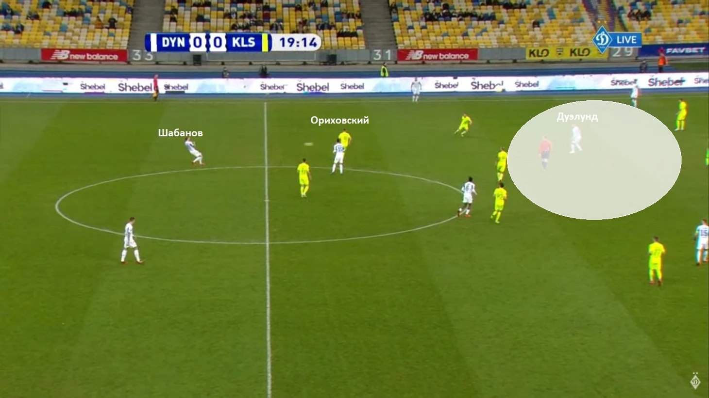 Также иногда правый центральный полузащитник Колоса Ориховский выдвигался на Шабанова. В основном он делал это в правильный тайминг и отлично сдерживал развитие атаки Динамо, однако время от времени с помощью движения Дуэлунда киевляне находили пространство между линий соперника.