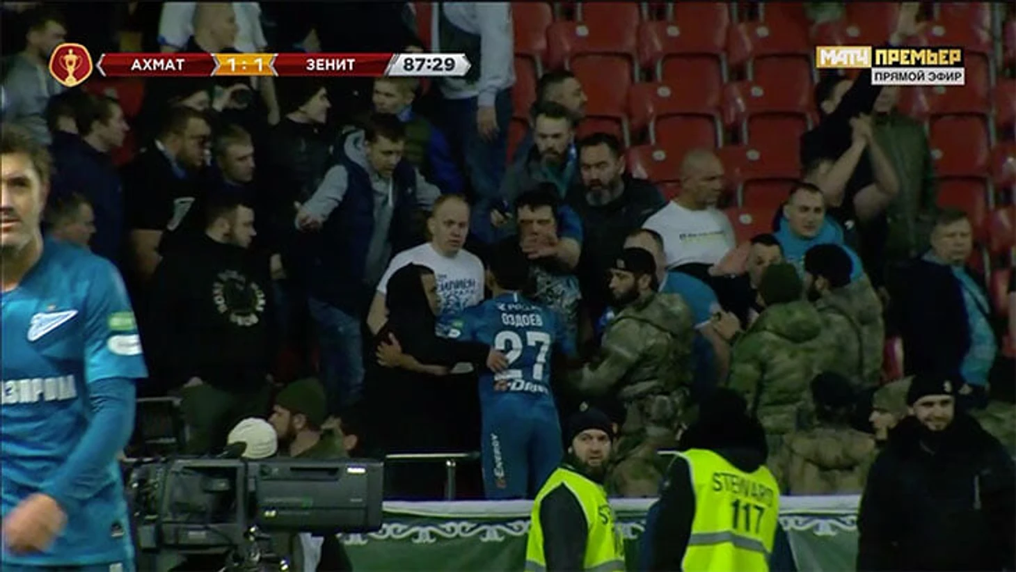 Кубковый четвертьфинал «Ахмат» – «Зенит» перестал быть спокойным на 85-й минуте. К тому моменту хозяева не очень логично забили с пенальти, а петербуржцы с трудом отыгрались. Внезапно за пять минут до конца после эпизода в штрафной «Ахмата» все отвернулись от поля, потому что вспыхнуло вокруг гостевого сектора.