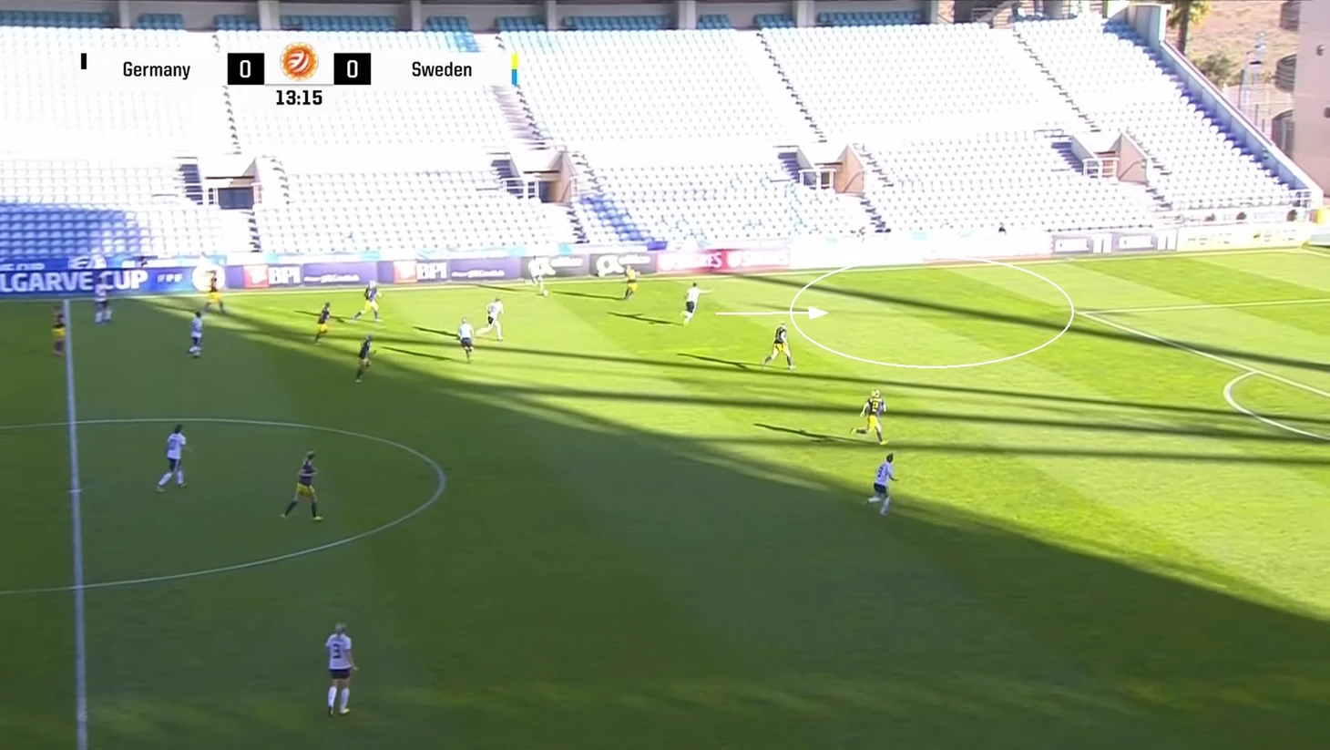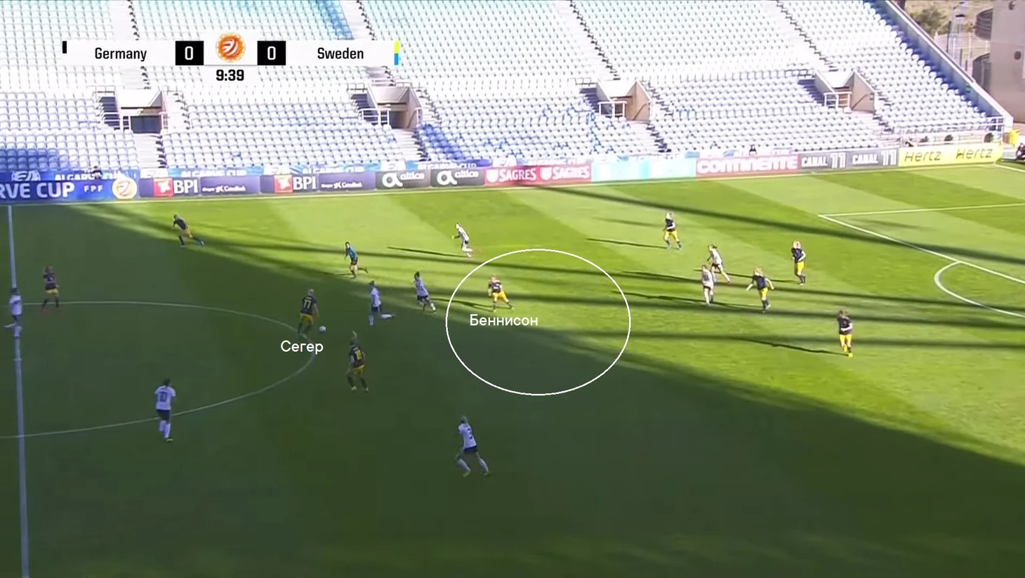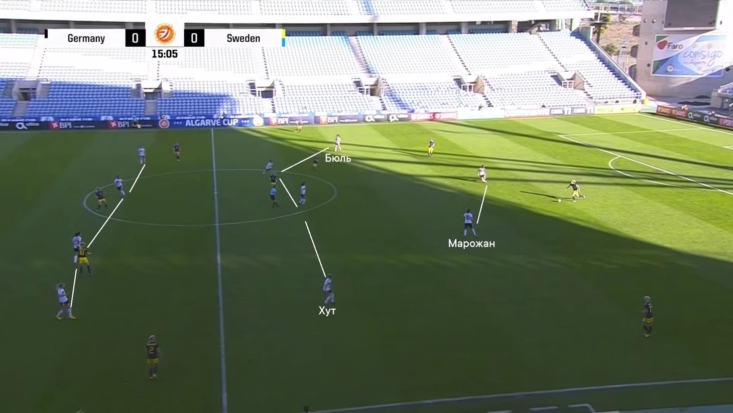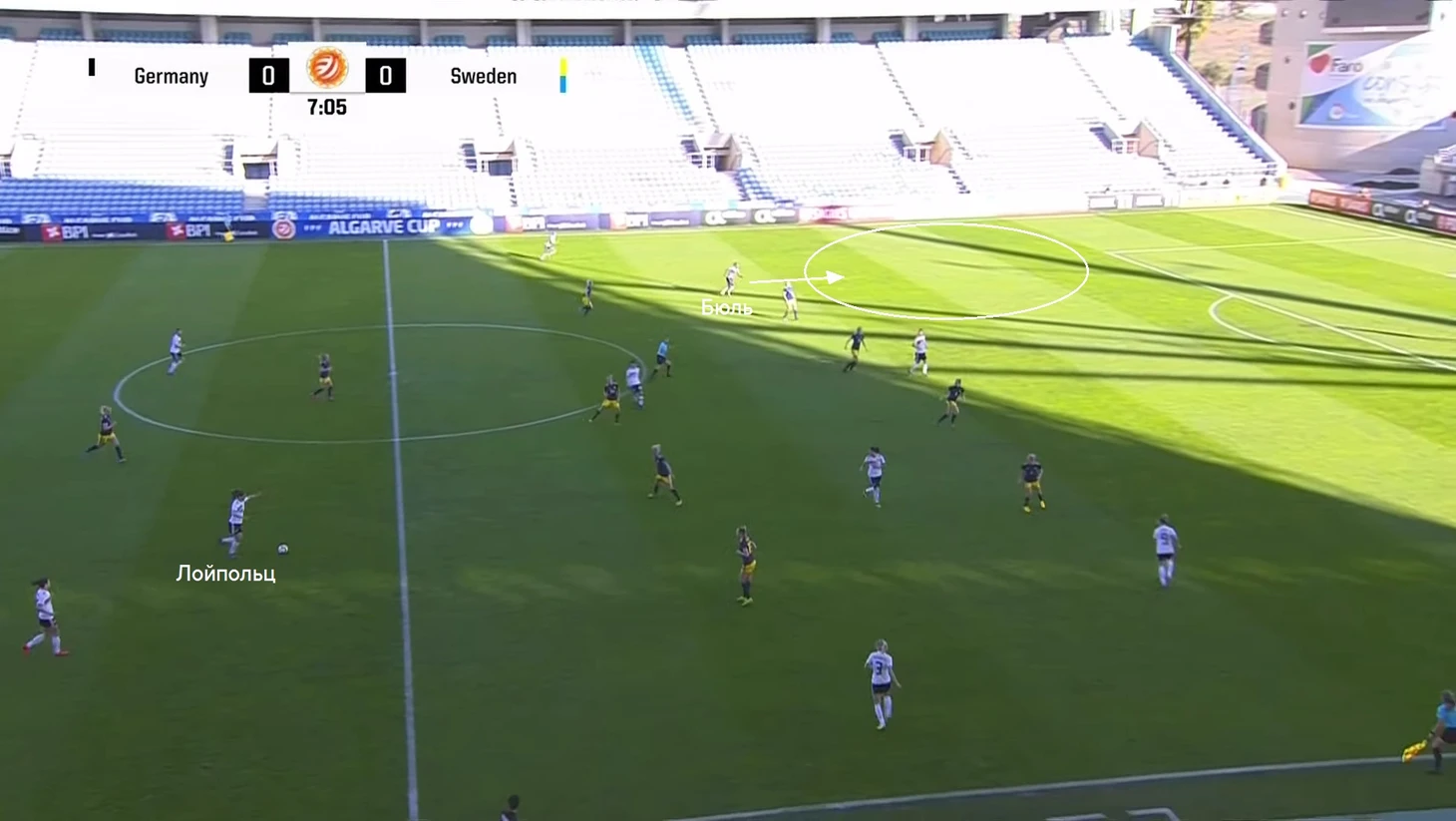 В таком сценарии Швеция позволяла разыгрывать мяч в первой стадии, перекрывая центр и отправляя атаки соперника на фланг. Такой вариант был для Германии вполне удобен. На флангах у них есть Клара Бюль и Свэнья Хут, которые могут убегать за спины защитникам. Швеция хоть и не прессинговала, но и не парковалась, поэтому свободные зоны для забегания нападающих были. Это был главный способ доставки мяча до штрафной.