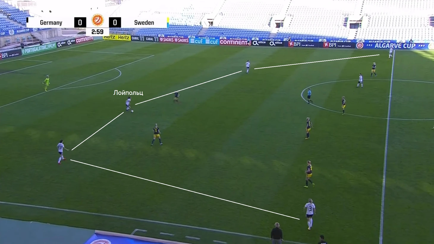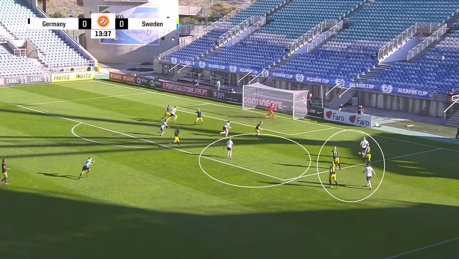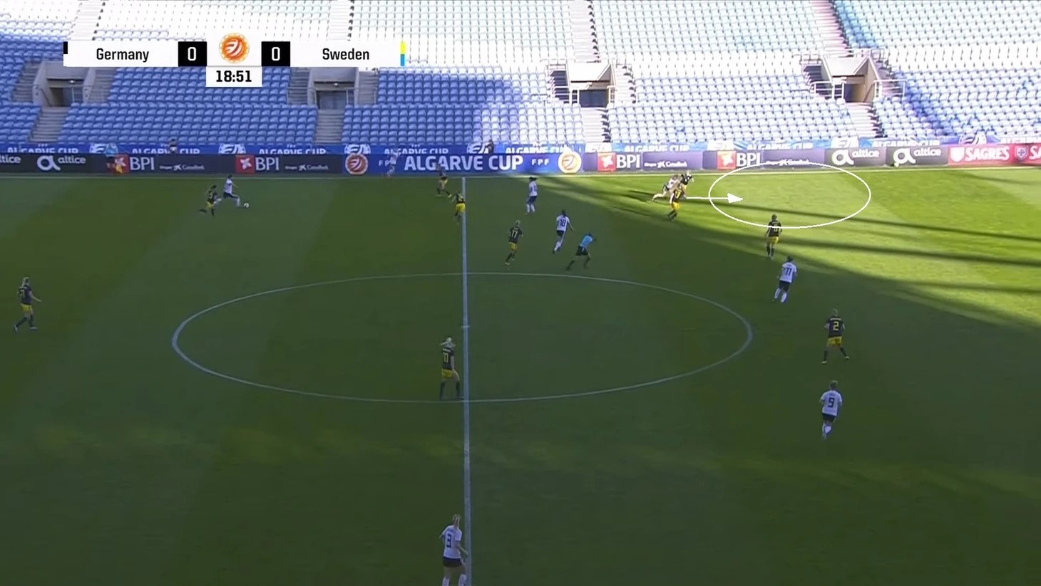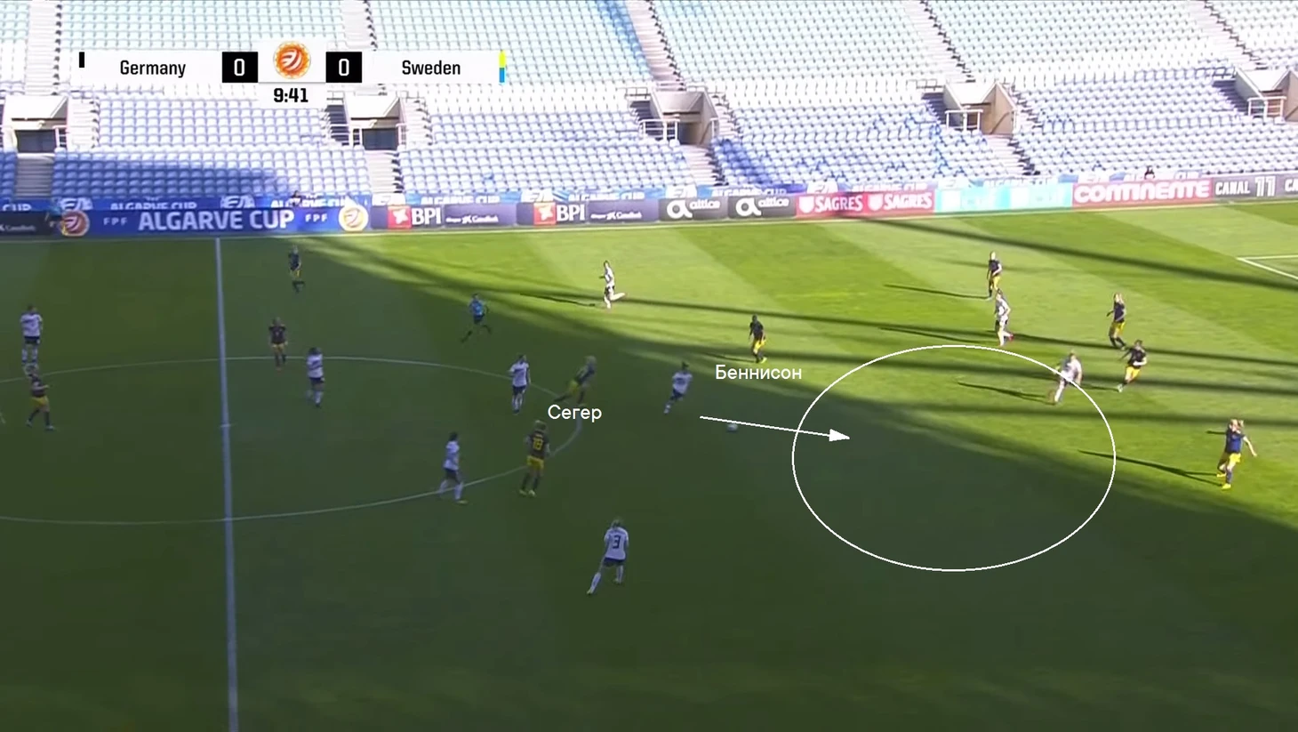 В таком сценарии Швеция позволяла разыгрывать мяч в первой стадии, перекрывая центр и отправляя атаки соперника на фланг. Такой вариант был для Германии вполне удобен. На флангах у них есть Клара Бюль и Свэнья Хут, которые могут убегать за спины защитникам. Швеция хоть и не прессинговала, но и не парковалась, поэтому свободные зоны для забегания нападающих были. Это был главный способ доставки мяча до штрафной.