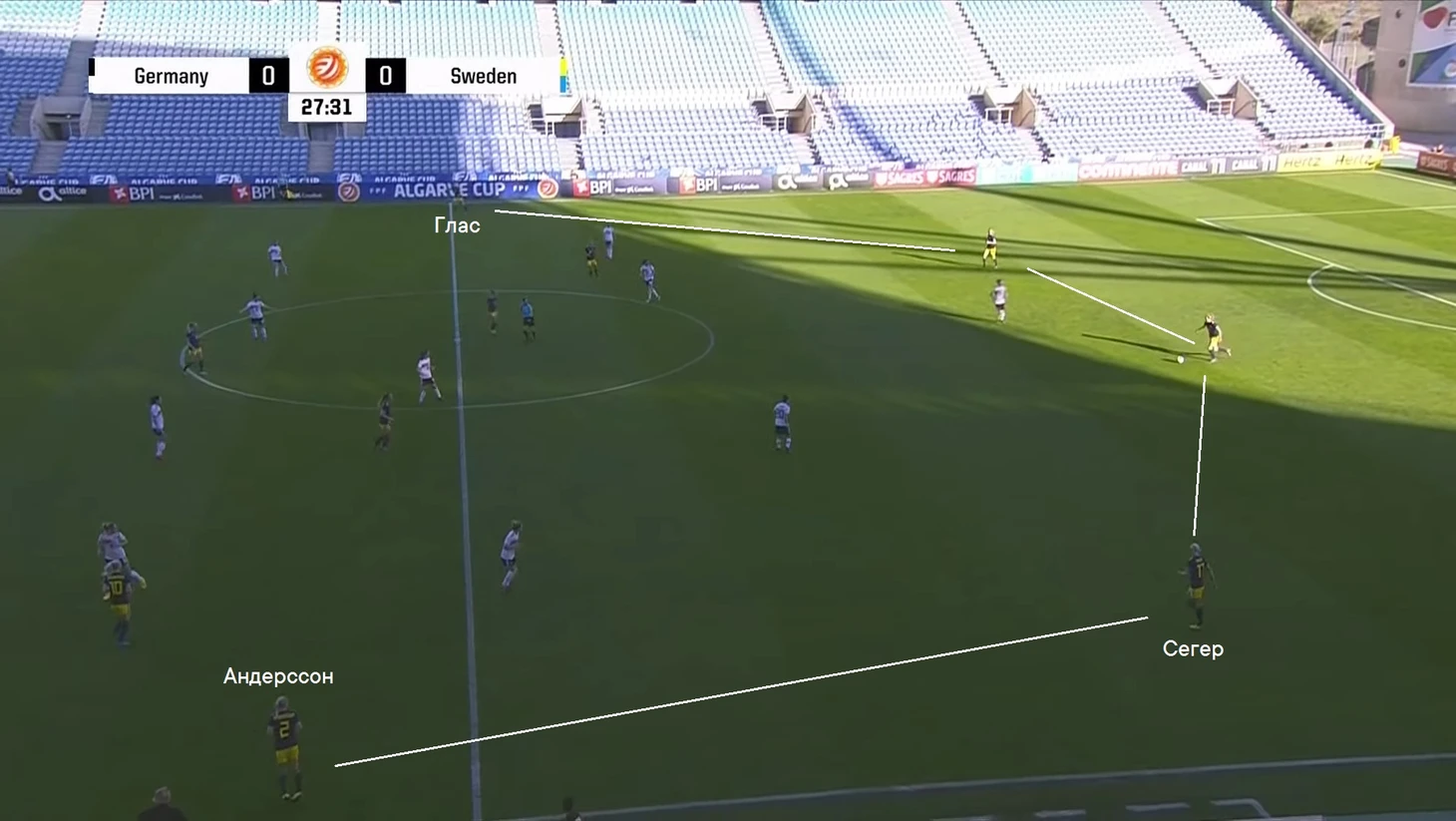 Швеция в первой стадии атаки использовала вариацию того же приёма, который мы видели у Германии. С той лишь разницей, что Сегер опускалась на позицию левого крайнего защитника, а не между двумя центральными. Андерссон и Глас поднимались высоко. Но главная разница в том, что шведки в обоих случаях (на скриншоте выше такая же ситуация) теряли мяч сразу же после заброса на фланг: