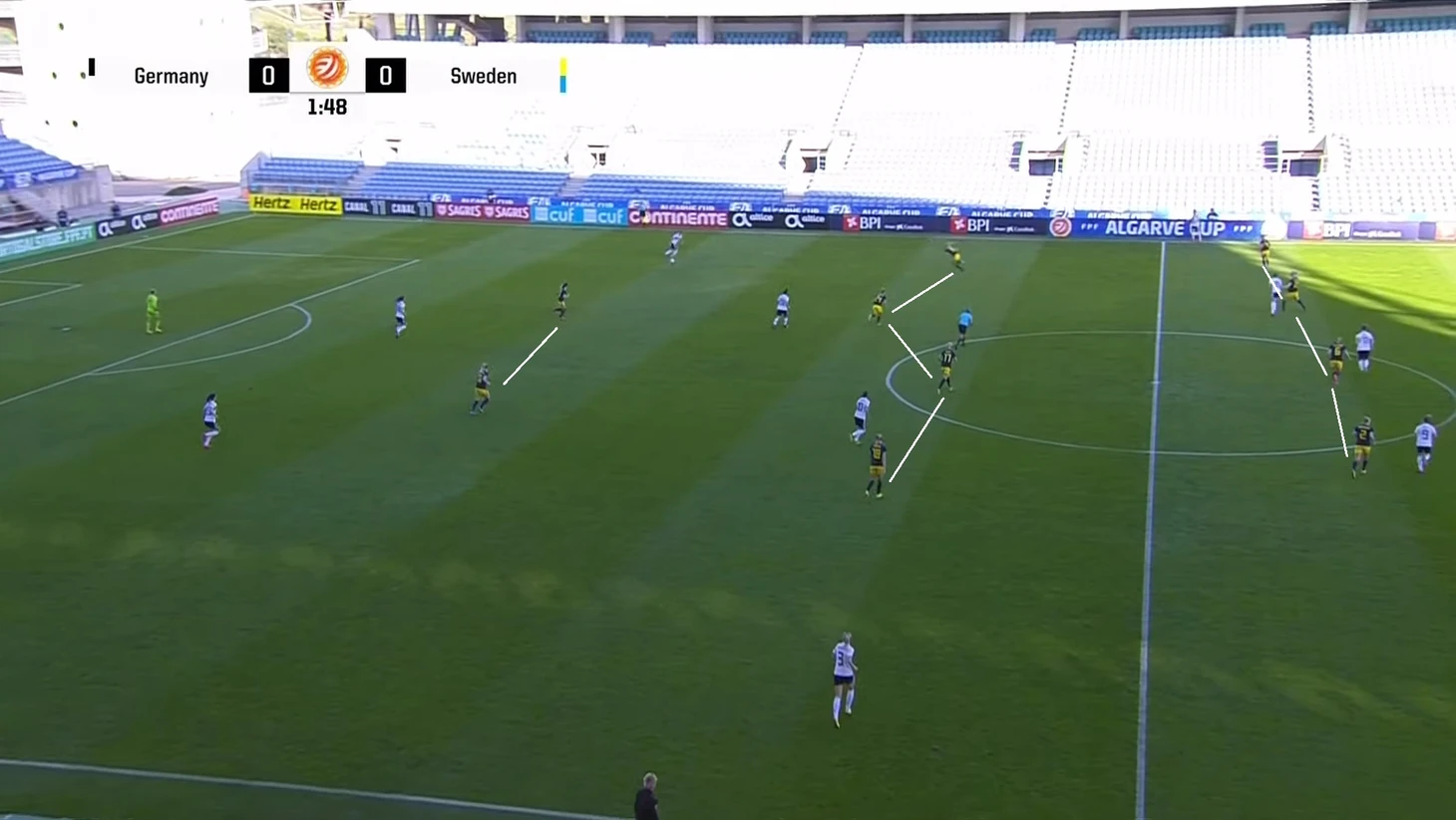 Большинство подобных эпизодов Германия доводила до опасного момента, Швеция не адаптировалась: можно было либо начать встречать соперника высоко, либо опустить линию защиты. Не было сделано ни того, ни другого, немки извлекали выгоду из сложившейся ситуации.
