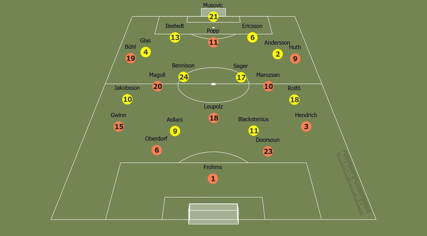 В такой формации можно было организовать давление в первой стадии атаки Германии (пара нападающих против центральных защитников, фланговые полузащитники против крайних защитников), но, во-первых, Швеция не прессинговала вообще, во-вторых, немки в позиционной атаке перестраивались. Лойпольц или Марожан опускались к паре центральных защитников, а Гвинн и Хендрих поднимались высоко по флангу: