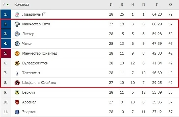 Несмотря на то, что с чемпионством в английской Премьер-Лиге, фактически уже все решено, наступает очень интересный отрезок сезона. Разгорается гонка за места в зоне еврокубков, и на мой взгляд, претендентов здесь семь: "Манчестер Сити", "Лестер Сити", "Челси", "Манчестер Юнайтед", "Вулверхэмптон", "Тоттенхэм" и "Шеффилд Юнайтед".