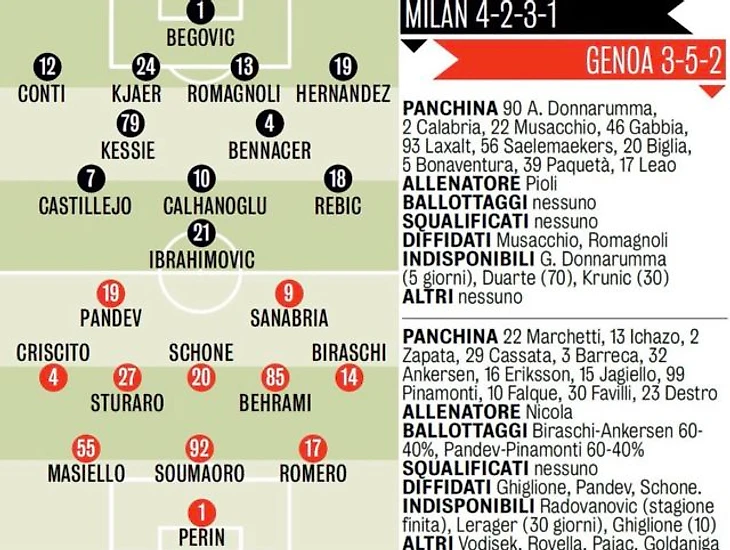 La Gazzetta dello Sport предположила традиционную раскладку, издание считает, что с первых минут появится Симон Кьяер в обороне, а недавний дебютант Габбиа останется на лавке запасных. Андреа Конти выйдет вместо Калабрии, составив четвёрку в обороне с Романьоли, датчанином и Тео Эрнандесом.