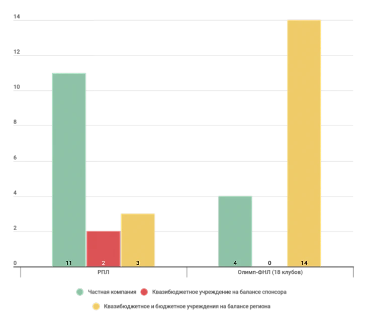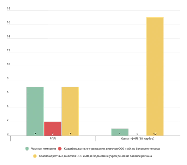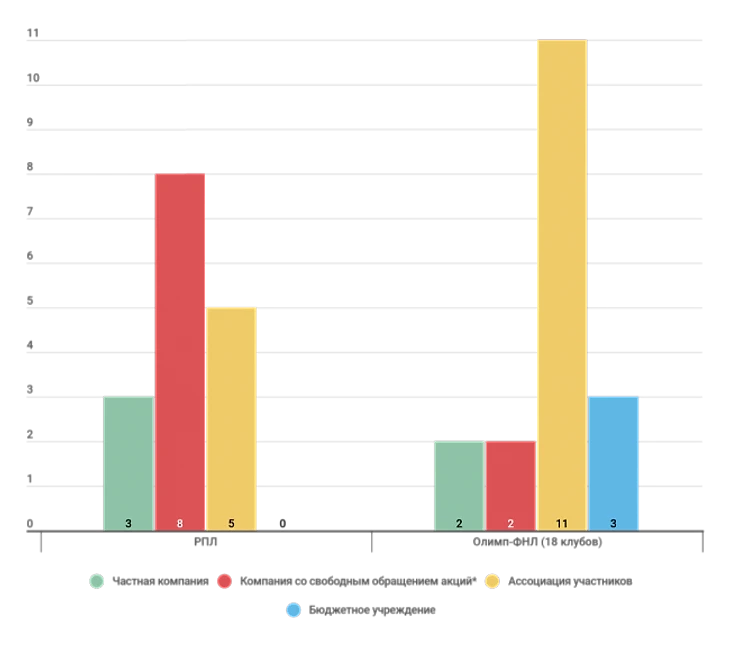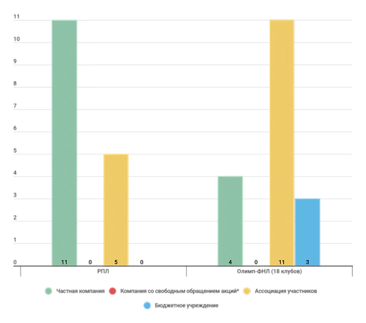 В Олимп-ФНЛ рассмотрим 18 клубов из 20 («Спартак-2» и «Краснодар-2» – это фактически фарм-клубы первых команд, их учет только исказил бы картину). Под частными компаниями понимаем ООО, под компаниями со свободным обращением акций – АО и единственное ОАО («Урал»), под ассоциациями – все возможные некоммерческие структуры (АНО, некоммерческие партнерства, ассоциации, общественные организации). Бюджетные учреждения – государственное бюджетное нетиповое общеобразовательное учреждение («Чертаново»), автономное учреждение муниципального образования городской округ («Химки»), государственное автономное учреждение («Ротор»). В РПЛ, кстати, такое тоже было: «Рубин» существовал в форме муниципального автономного учреждения, однако с февраля 2018 года действует одноименное ООО, которое, видимо, и ведет дела клуба.