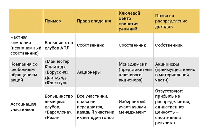 Для нас главная колонка не крайняя справа, а крайняя слева – организационные формы клубов. Их, доказавших свою универсальность в разных лигах и ситуациях, три: