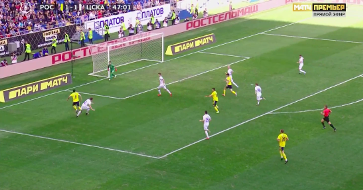 Первое подозрение – офсайд. В трансляции не показали офсайдные линии – возможно, потому что их даже не рисовали (их рисуют только в сложных моментах). С этого ракурса невозможно ничего сказать достоверно, но вероятность вне игры все же минимальна.