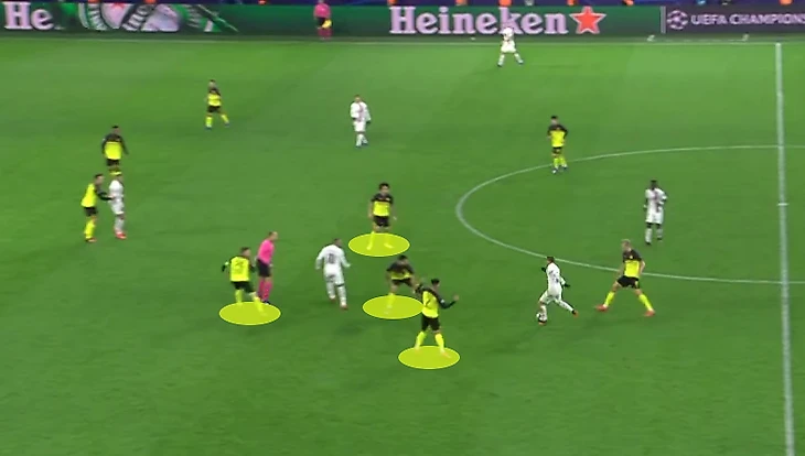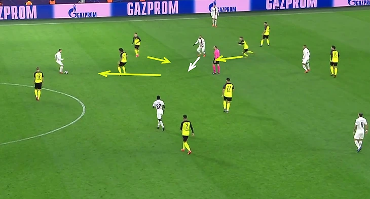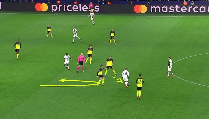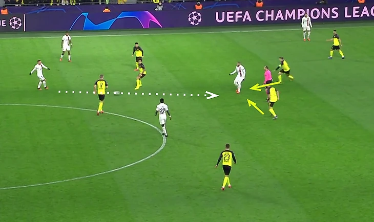На скриншоте выше можно увидеть как пытался этот приём использовать Неймар и как хорошо готов был к этому Дортмунд - при подстраховке с фланга от Санчо бразилец всё так же оказывался против двоих оппонентов.