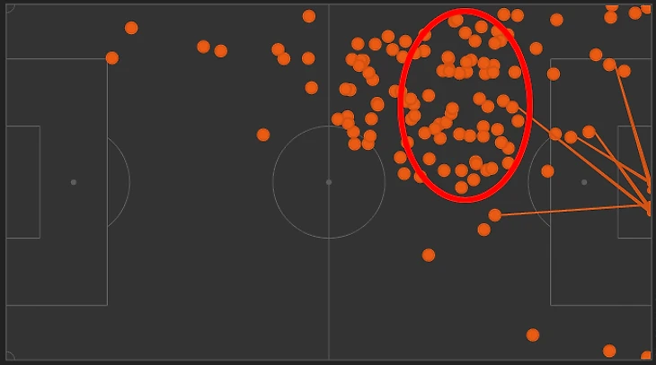 Давайте попробуем сравнить карту касаний Неймара в игре с Боруссией и в других матчах.