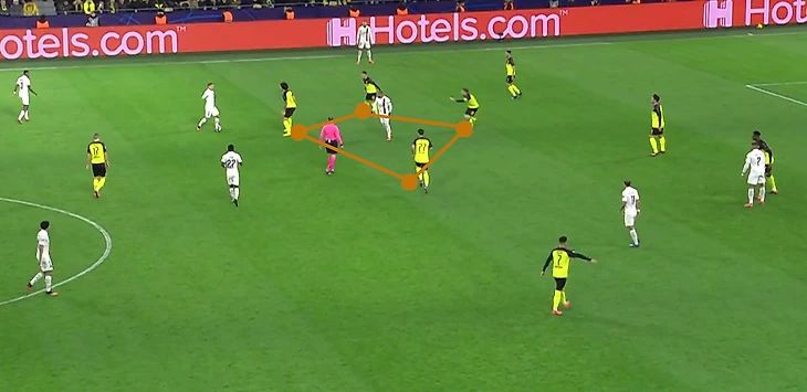 Вообще узкое расположение номинальных фланговых нападающих Боруссии при обороне по сути давало ещё одного игрока в центре поля и тот же Неймар оказывался практически в ромбе из игроков в чёрно-жёлтой форме.